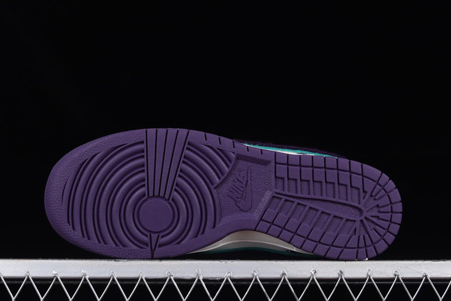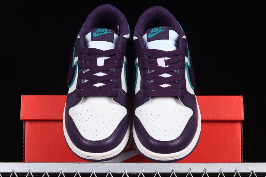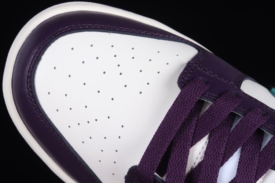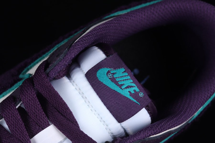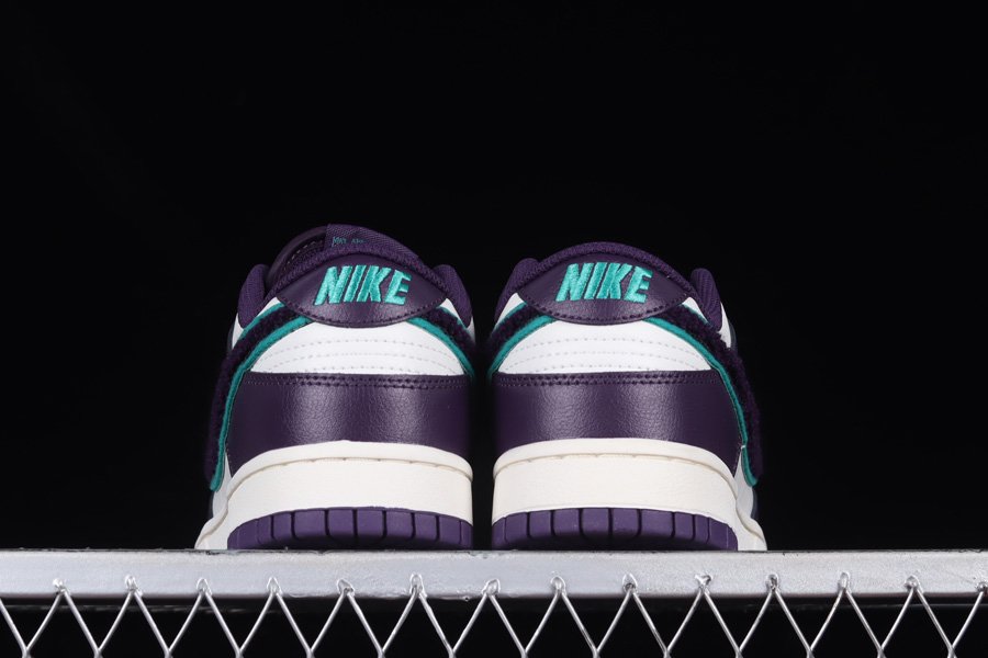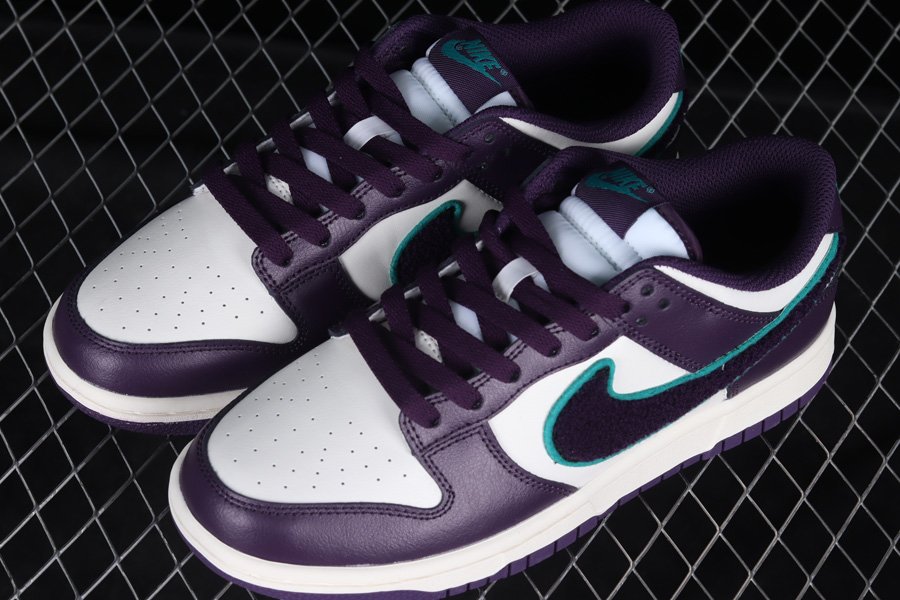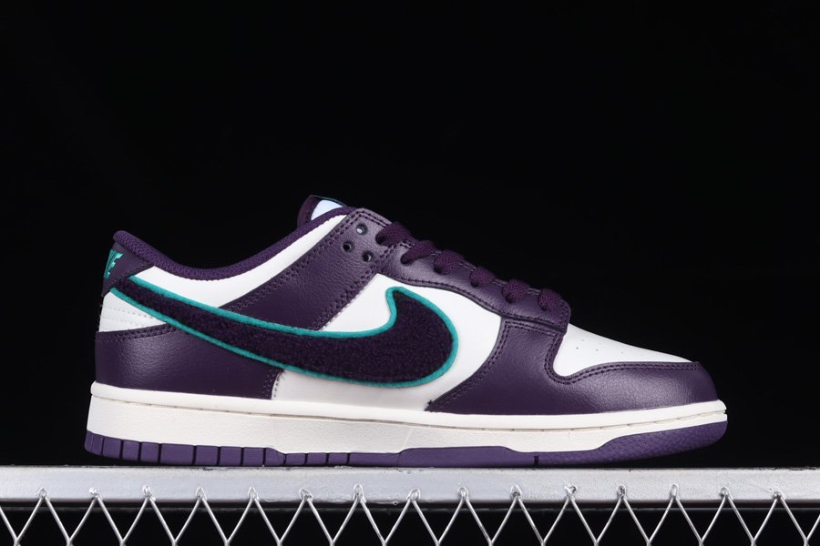 The Nike Dunk Low Chenille Swoosh comes dressed in a White leather base contrasted by the Purple leather overlays and Aqua accents throughout. The highlight of the sneaker are the Purple Chenille Swooshes on the sides decorated with the Aqua outline. A Sail midsole and Purple rubber outsole complete the look.