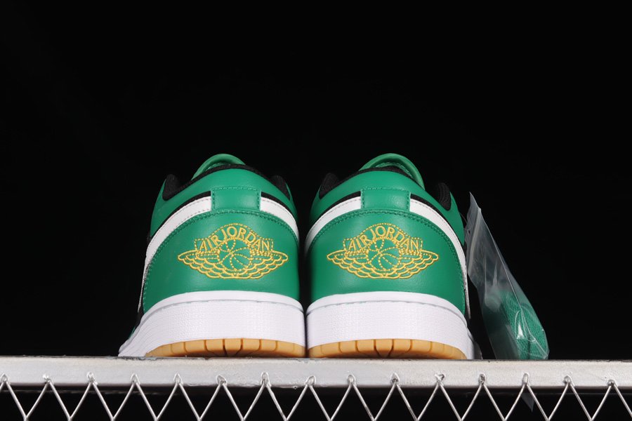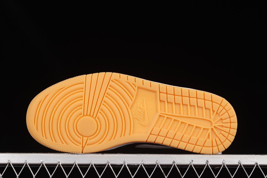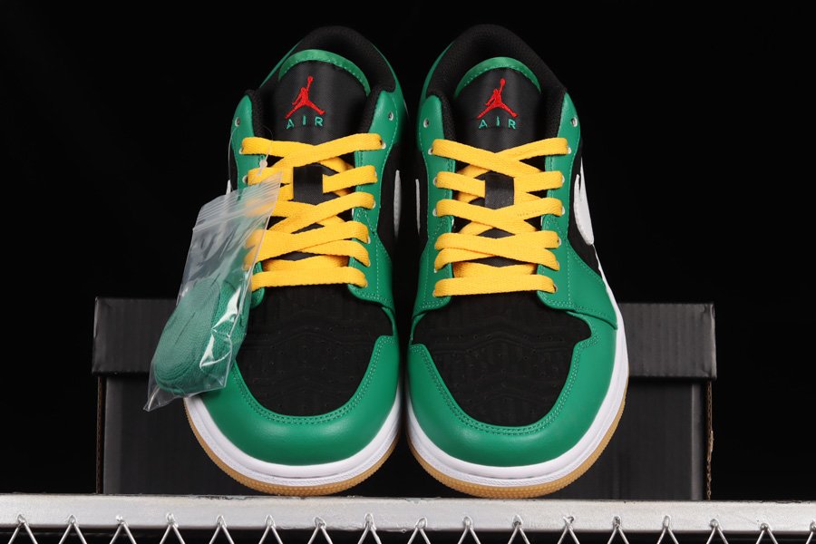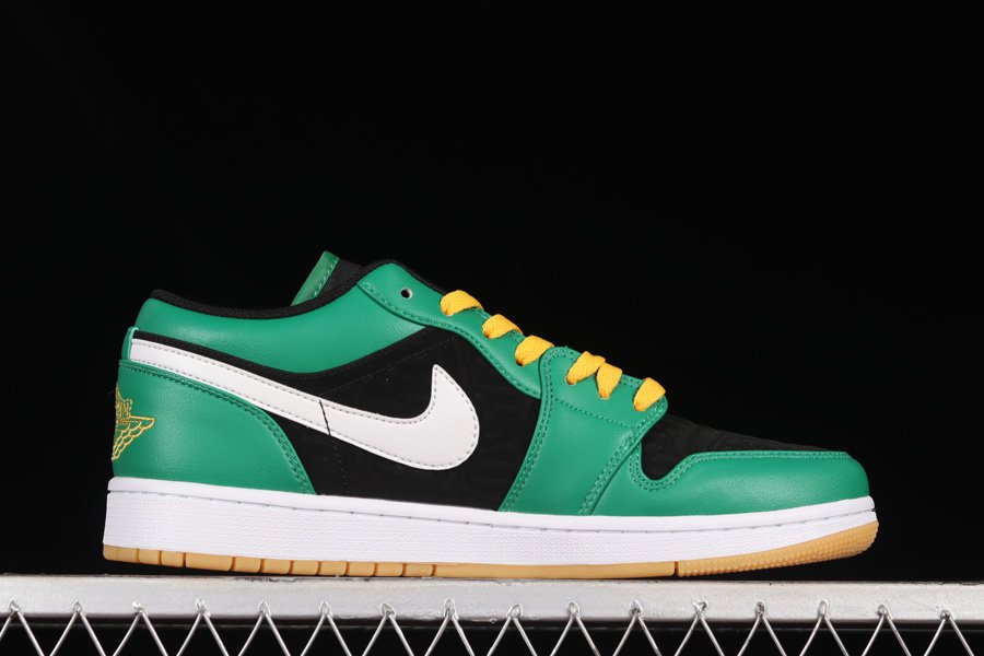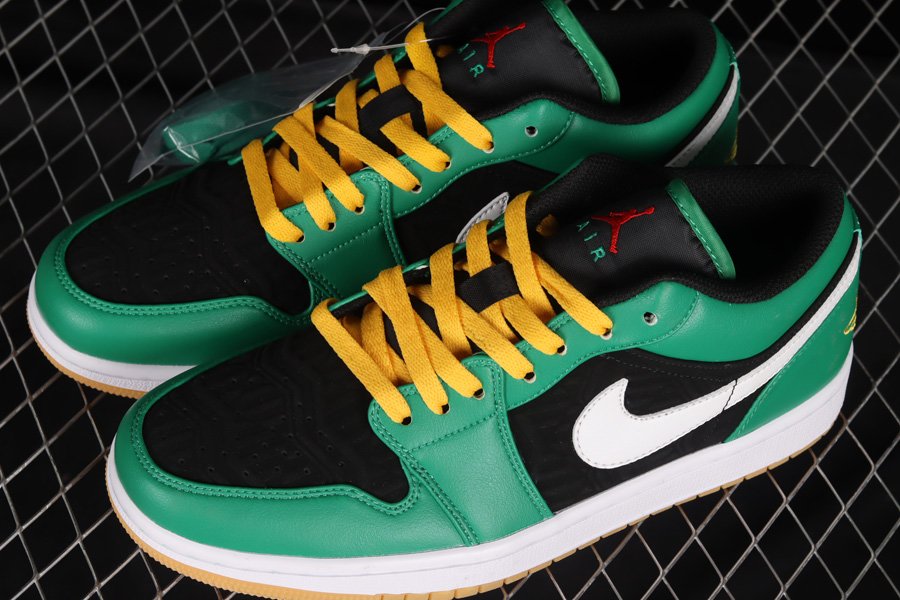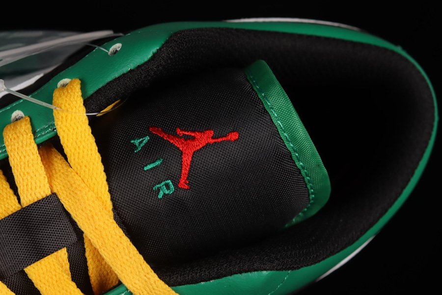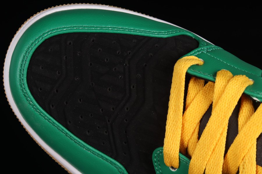 The standout colour on this AJ1 is green, appearing on the toe cap, the eye stay panel, the mudguard, the collar and the heel counter. The base of the shoe is a pitch-black nubuck material with a lasered geometrical pattern. The signature profile Swooshes on both the medial and lateral sides of the shoe are pure white, contrasting nicely with the black backdrop. More festive colours can be found on the yellow laces and the embroidered red Jumpman on the black nylon tongue. A white midsole and a caramel-coloured gum outsole wrap up the look of these kicks.