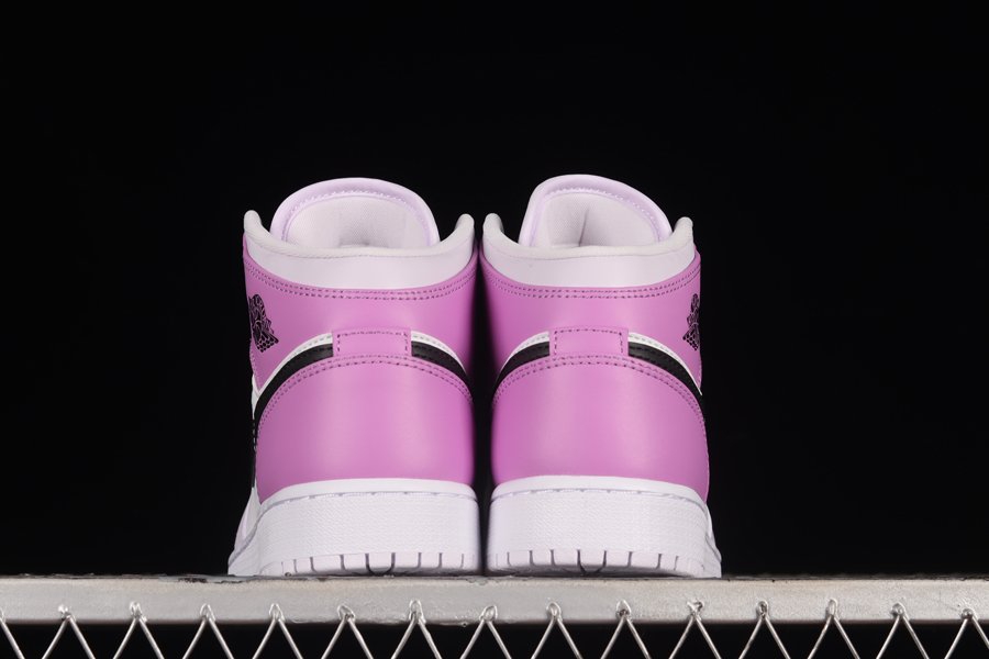 Introducing a new colorway of the Air Jordan 1 Mid designed for grade schoolers, featuring a charming Pink Lavender combination. The upper is entirely made of leather, with a white base and light pink around the toe area, and a brighter shade on the ankle and heel portions. Black accents on the Swooshes, Jumpman logos, and laces add contrast to the design. The sneaker is completed with a white rubber midsole and a lavender rubber outsole. This Air Jordan 1 Mid is perfect for young sneaker enthusiasts looking for a stylish yet comfortable shoe.