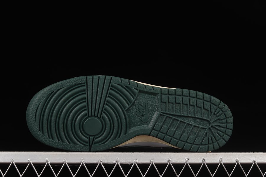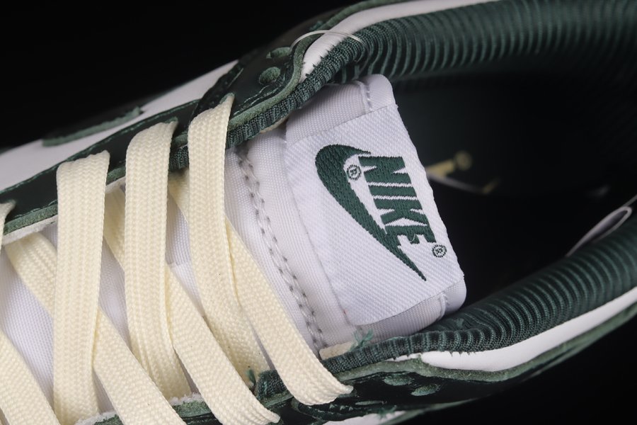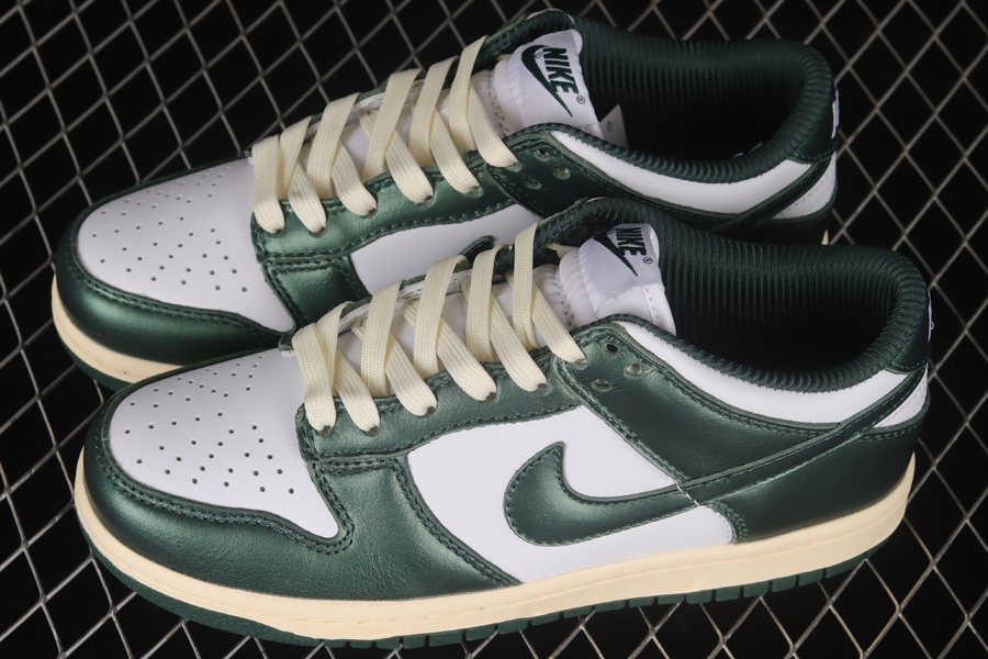 This Nike Dunk Low comes equipped with a full leather construction on the upper as White serves as the base color with more white seen on thee nylon tongues and the embroidered Nike branding on the heels. A shiny green leather is then placed on the overlays, Swooshes, and heel tabs along with more of the same hue on the inner liners and tongue branding. The vintage look is provided courtesy of cream on the laces and insole branding as well as the yellowed rubber midsole down below which sits atop a green rubber outsole.