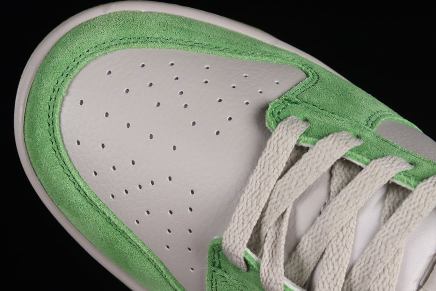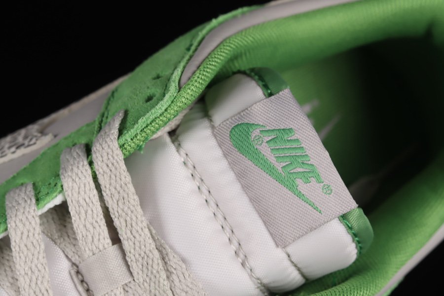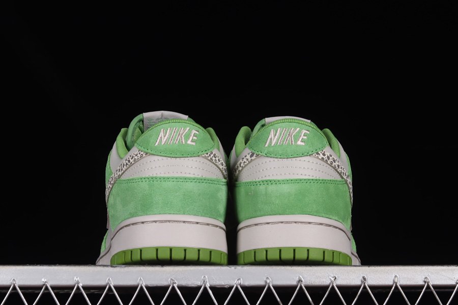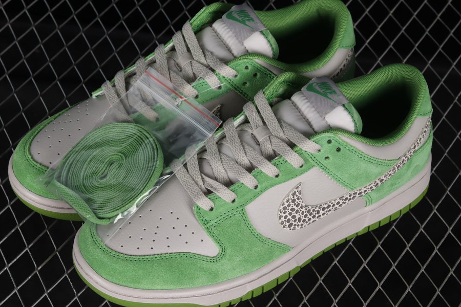 In addition to the Nike Dunk Low Safari Swoosh “Kumquat”, another colorway from the collection has surfaced with this “Chlorophyll” pair. This summertime colorway of the Nike Dunk Low starts off with a Light Ore leather base on the upper with tonal detailing noted on the tongues, laces, midsole, and the branding on the heels. For some vibrant color we see the addition of Chlorophyll green suede on the overlays as well as on the tongue branding, inner liner, heel tabs, and the rubber outsoles. The icing on the cake is the safari printed-Swooshes on the side panels.