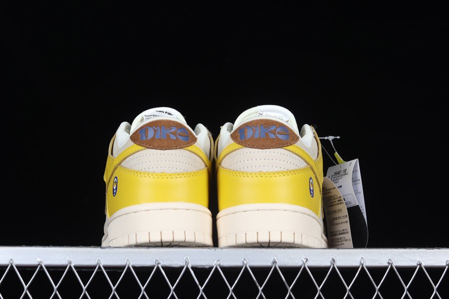 Finishing off the quirky fruit homage of this Dunk Low is a little blue sticker just like the ones on real bananas from the supermarket. Elsewhere at the rear, a dark burgundy suede badge with Nike branding provides a contrast. It ends with a cushioned cream sole unit that matches the upper perfectly.