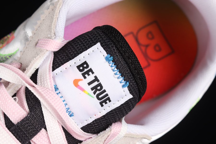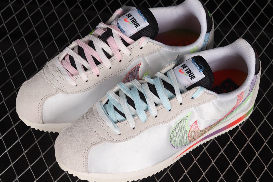 This special iteration of the Nike Cortez Be True comes dressed in a fairly subtle looking base that’s then decorated with pops of color spotted throughout. Design details include a White base paired up with Grey suede overlays. The subtlety of the sneaker stop there as the sneaker is then highlighted by the overlapping Swooshes done in gradient coloring resulting in a rainbow-lie motif. Other details include the colorful gradient aesthetic on the insoles and part of the midsoles, the “BE TRUE” branding on the tongue tags, Black tongues, Pink and Blue laces and Red and Green “Nike” branding on the Black heel tabs.