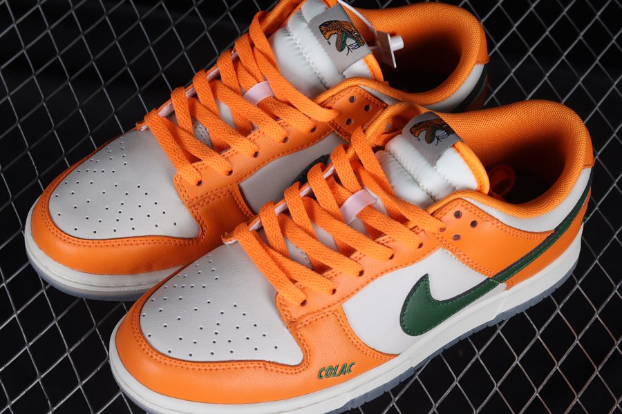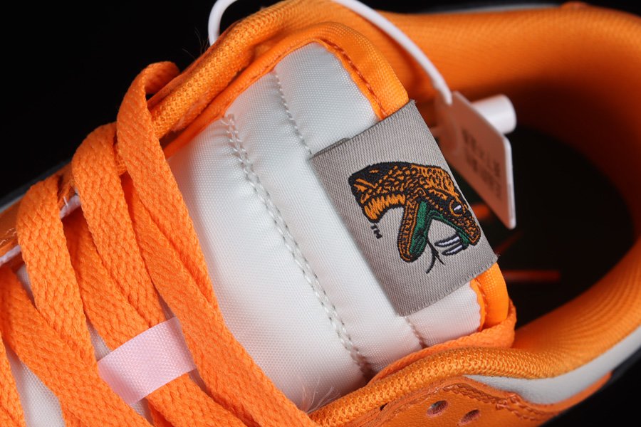 This Nike Dunk Low features the school’s colors with White on the base and Orange on the overlays, liner, and laces. Next, Green fills in the Swoosh logos, the school’s rattlesnake, the Rattler mascot on the tongue, 1887, the year the university was founded, embroidered on the heel, and text behind the tongues. On the lateral forefoot, we have ‘COLAC’ text (College of Love and Charity) and a graphic across the translucent outsole.