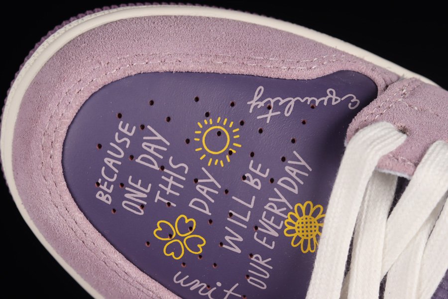 This “Unity” iteration of the Air Jordan 1 Low promotes positivity and equality. The sneaker is constructed in a mix of leather, suede, and corduroy all while being dressed in Purples and Violets hues with Yellow contrasting accents. Taking a closer look you will find design details such as the unity message on the toe box that reads, “Because One Day, This Day Will Be Our Everyday” as well as etchings that read “Unity” and “Equality”.