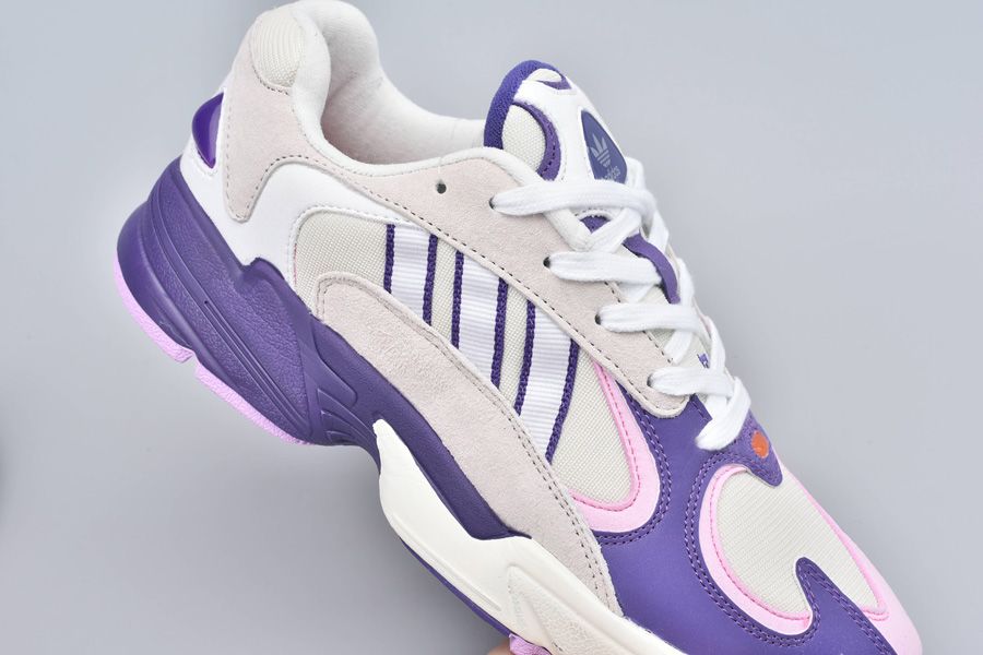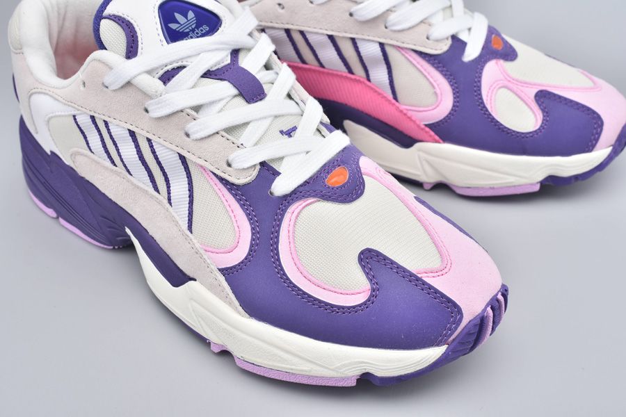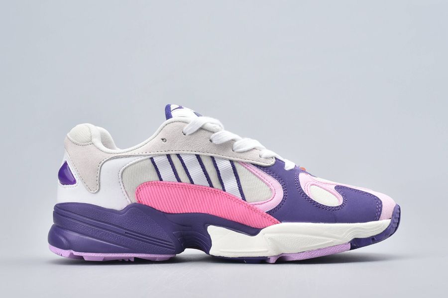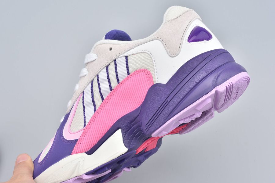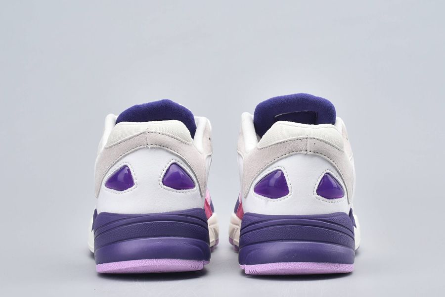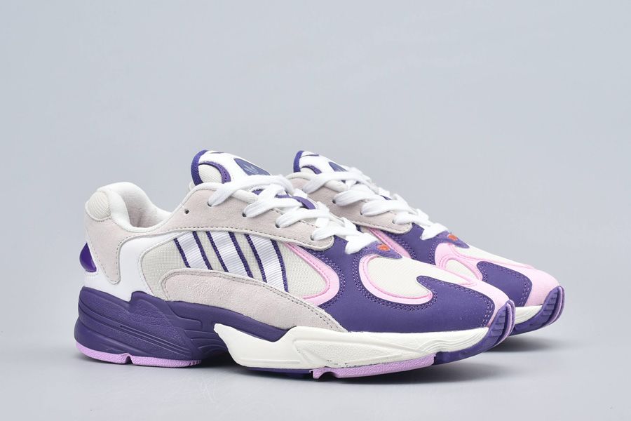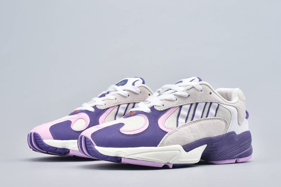 Dressed in a Cloud White, Unity Purple and Clear Lilac color scheme. Designed to look like the character Frieza, the shoe sports a White mesh and leather upper paired with Purple and Pink contrasting accents. The models design inspiration comes from the Yeezy Wave Runner 700 as well as the Temper Run Runner from the ’90s.