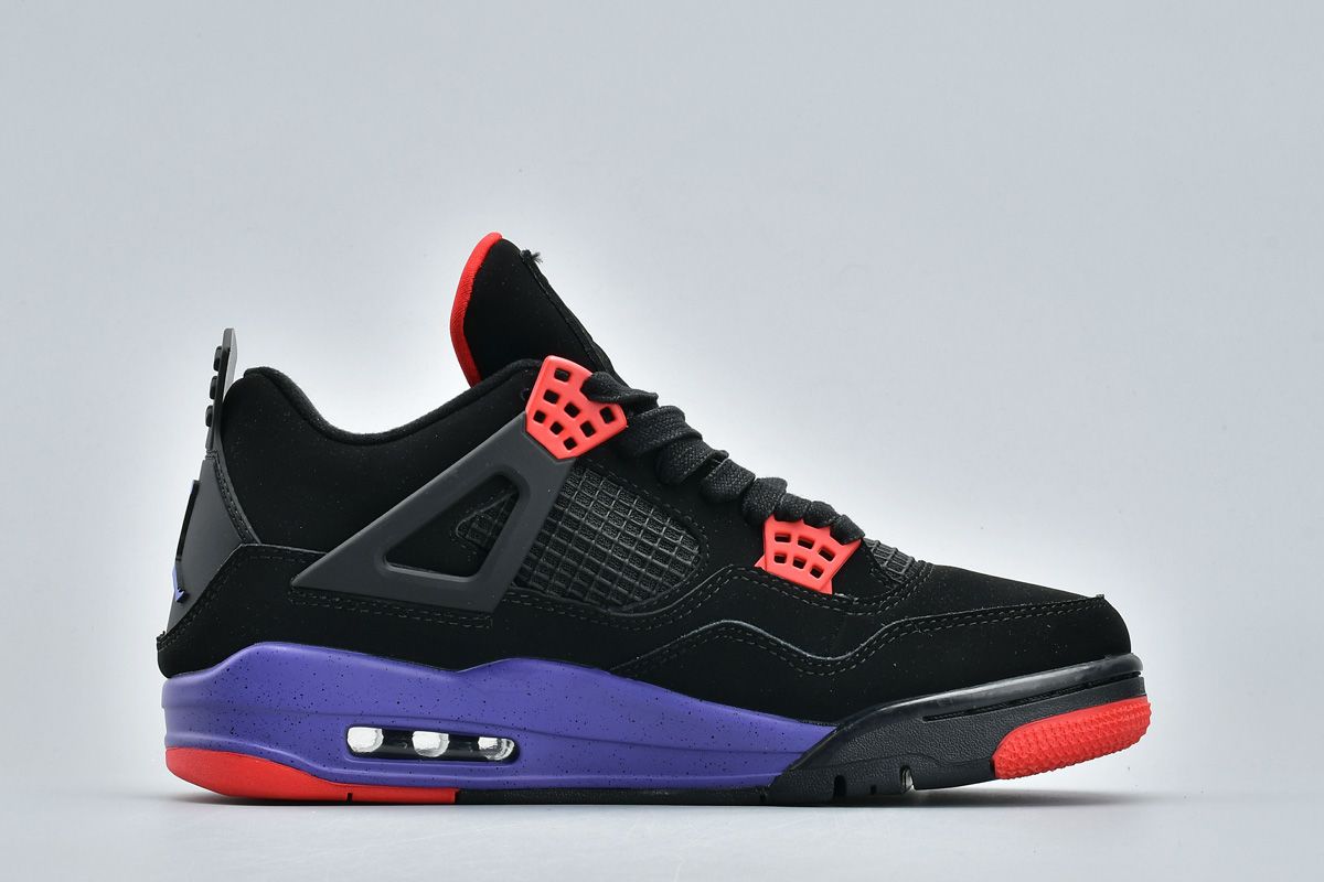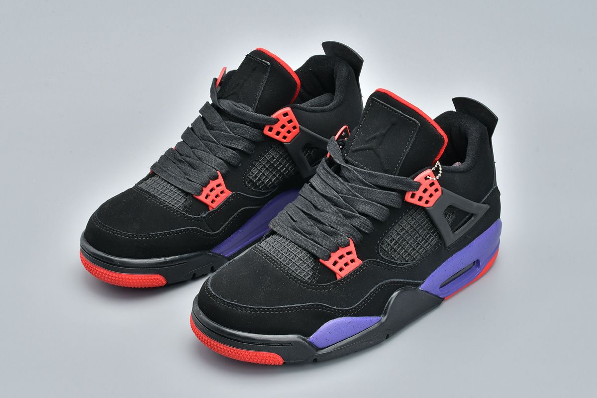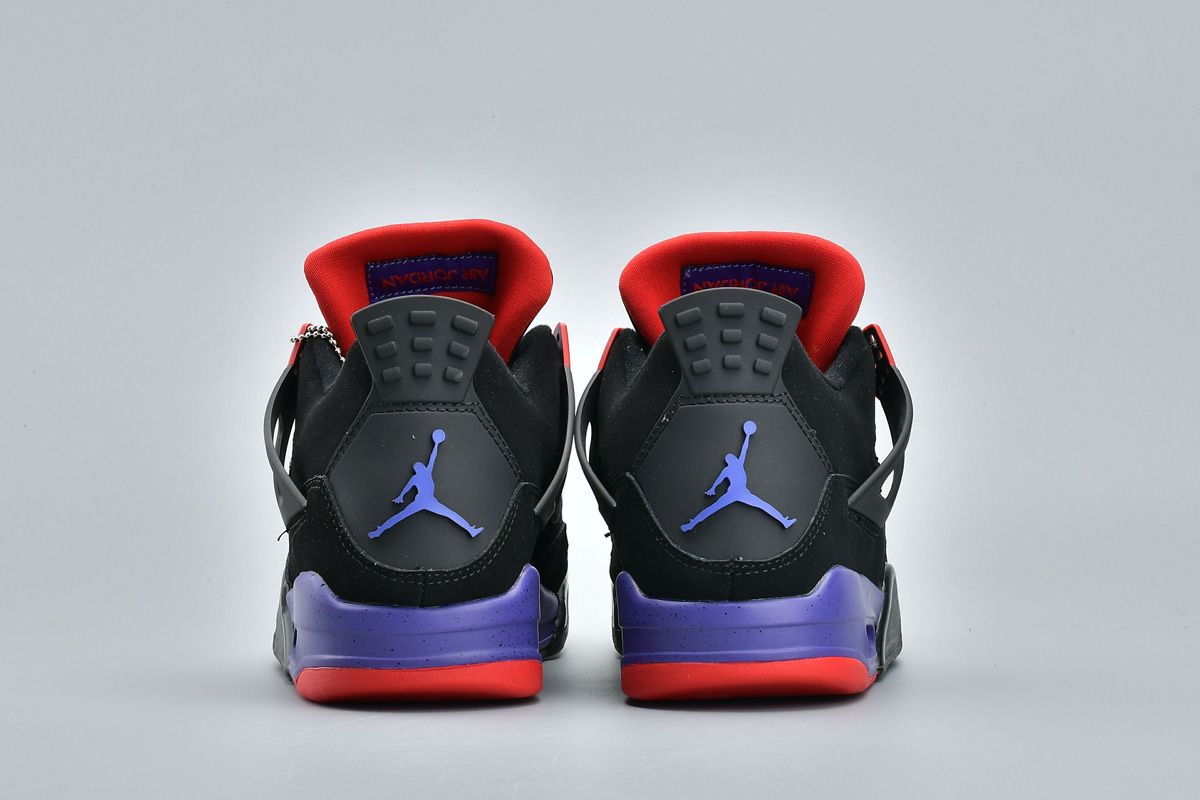 This Air Jordan 4 NRG Raptors sports a Black, University Red, and Court Purple color scheme. This Air Jordan 4 NRG features a Black suede upper paired with Purple and Red contrasting accents. A speckled midsole and Black and Red rubber outsole completes the design.