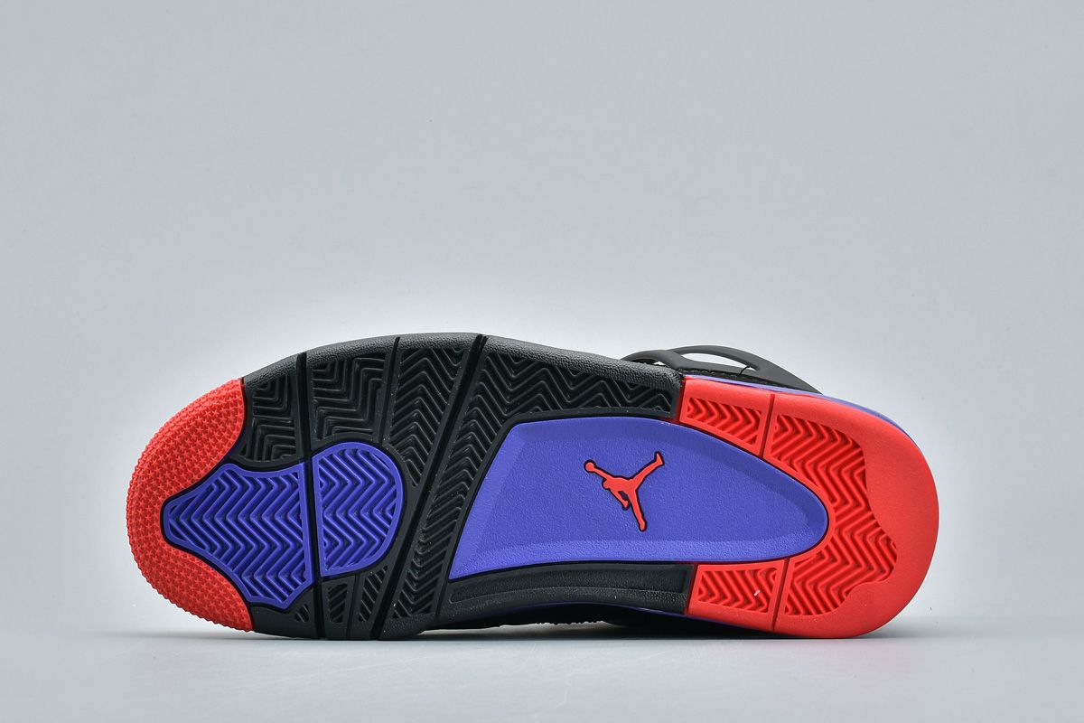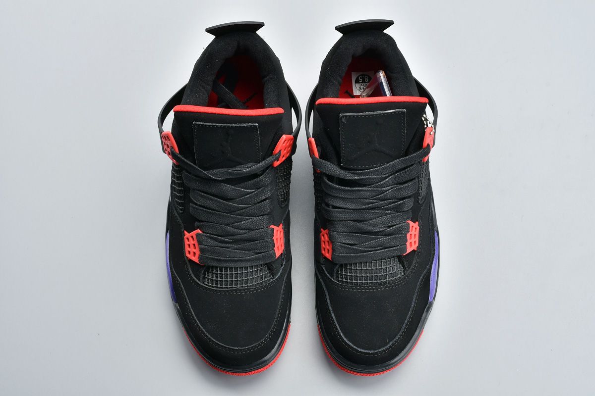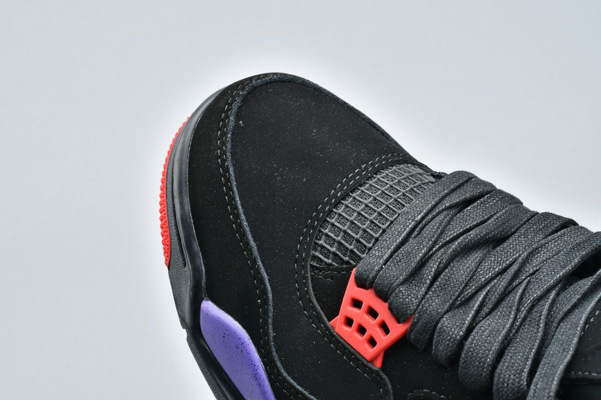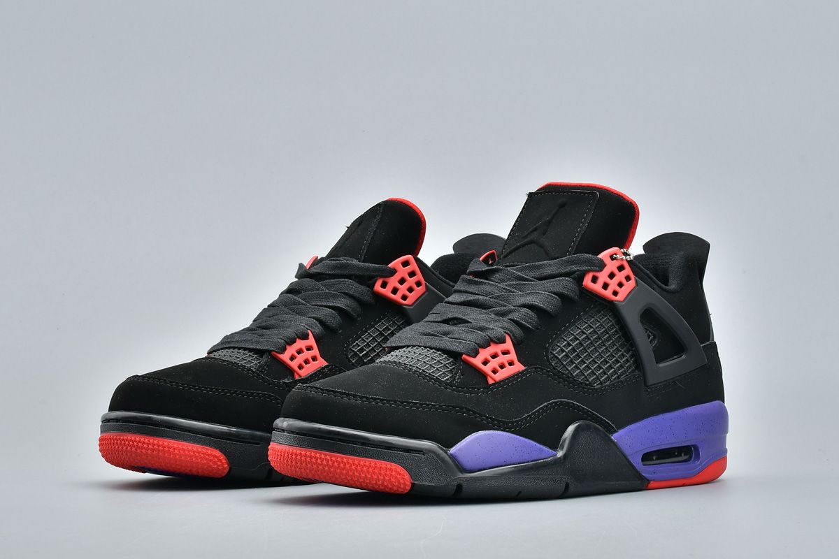 This Air Jordan 4 NRG Raptors sports a Black, University Red, and Court Purple color scheme. This Air Jordan 4 NRG features a Black suede upper paired with Purple and Red contrasting accents. A speckled midsole and Black and Red rubber outsole completes the design.