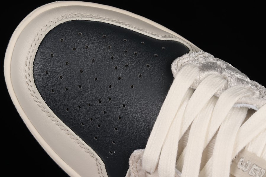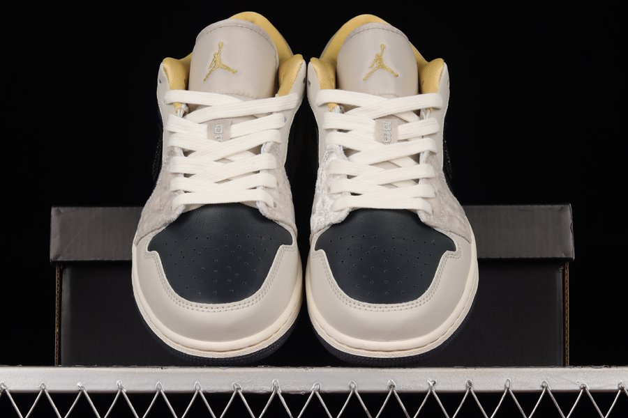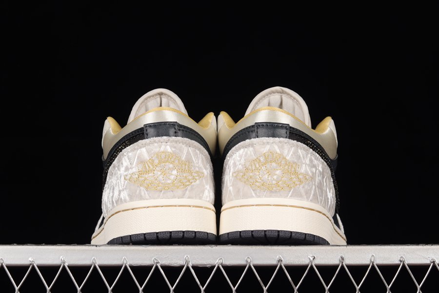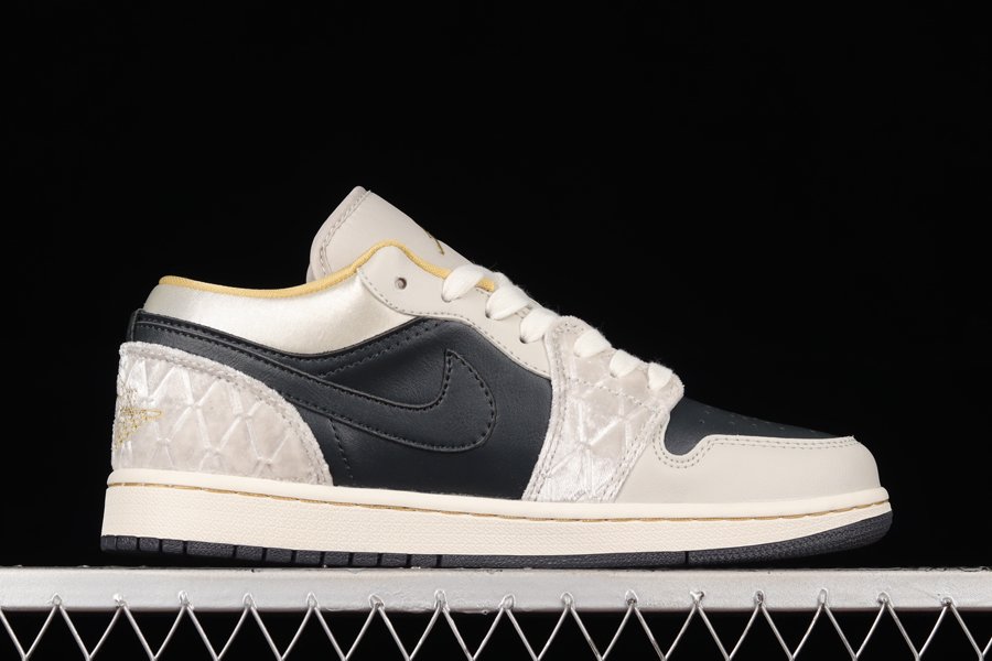 An additional look at the Air Jordan 1 Low “Beaded Swooshes” is showcased as this rendition is a premium lifestyle variation of the silhouette. Bearing a mixture of leather, satin, and diamond-patterned suede paneling, the model boasts a sleek color scheme of black and grey for its majority while hints of gold provide a luxurious touch. Furthermore, the low-top is defined by an iridescent beaded Swoosh, while a sail midsole with gold threading, and a black rubber outsole round out the design.