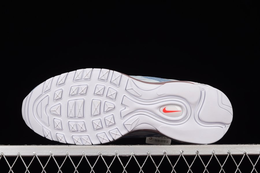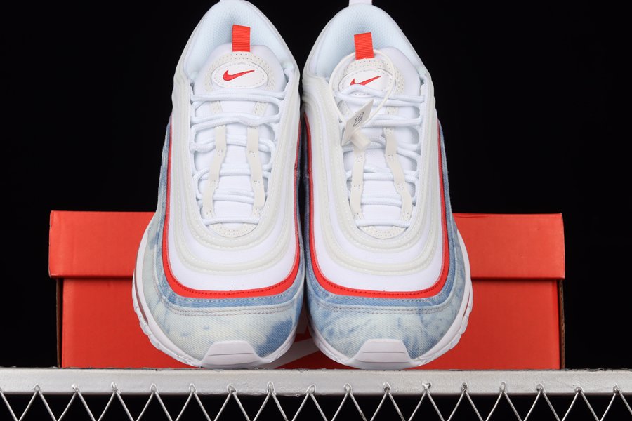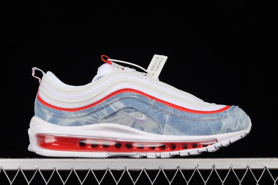 The Nike Air Max 97 “Washed Denim” starts off with a White mesh and leather construction on the upper with red/orange accents placed throughout the shoe for a pop of color. The defining feature on this Air Max 97 is the washed denim that wraps the entire mudguard. 3M reflective overlays, white Swooshes on the side panels, white midsoles with a red Air Max unit, and a full white rubber outsole finish off the look on this Nike Air Max 97 that will be dropping in the coming weeks.