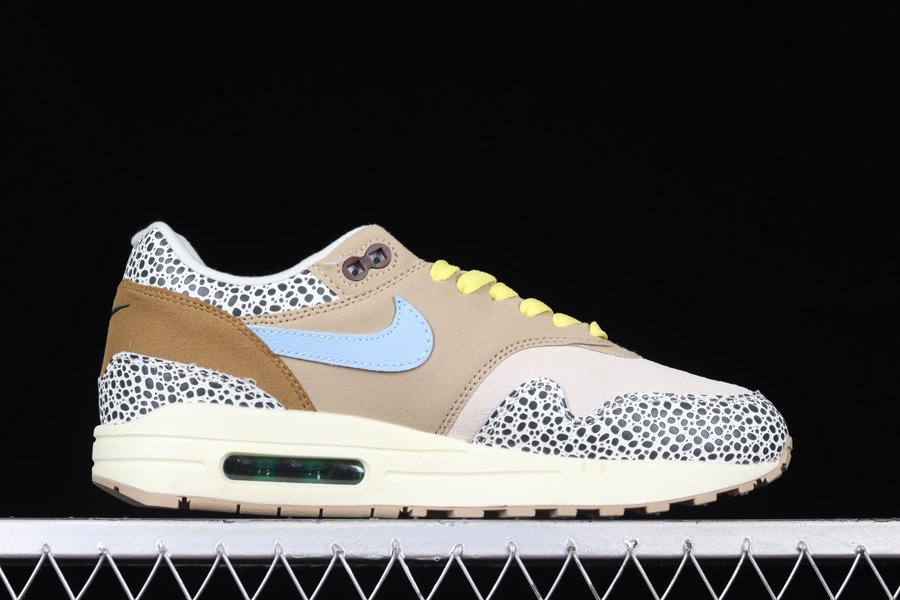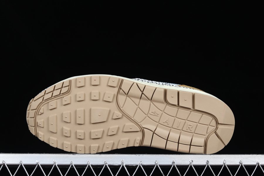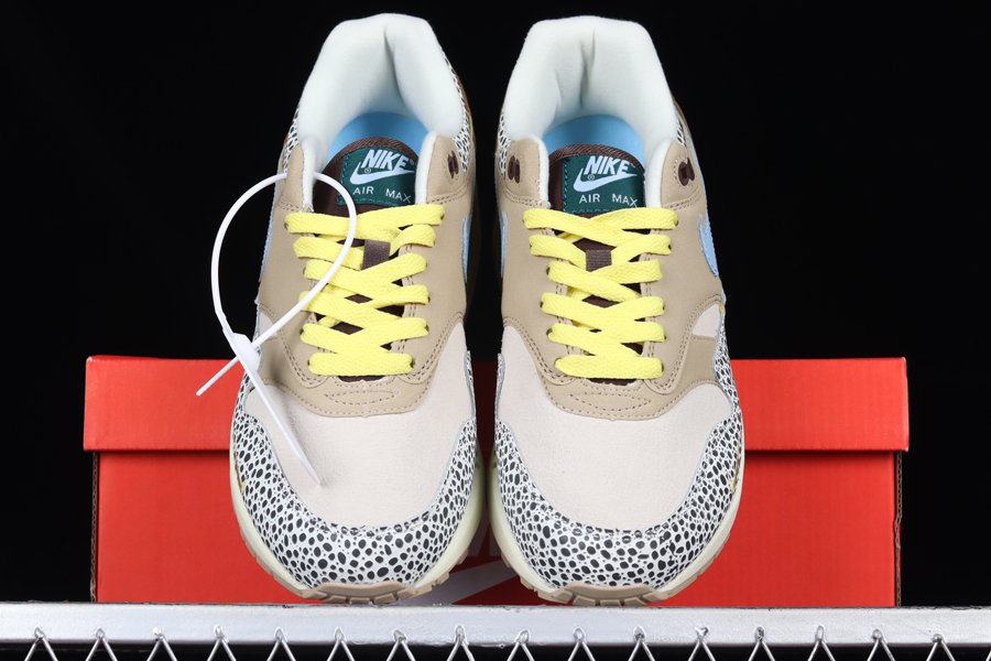 The Air Max 1 “Safari” features Cobblestone, Worn Blue, and Limestone color blocking. Just like the past models, it highlights a Safari print on the mudguard and collar, the pair features premium materials including nubuck, suede, and leather. Other highlights include a Blue textured Swoosh on the panels, Black Swoosh on the heel, and a Beige rubber sole to complete the look.