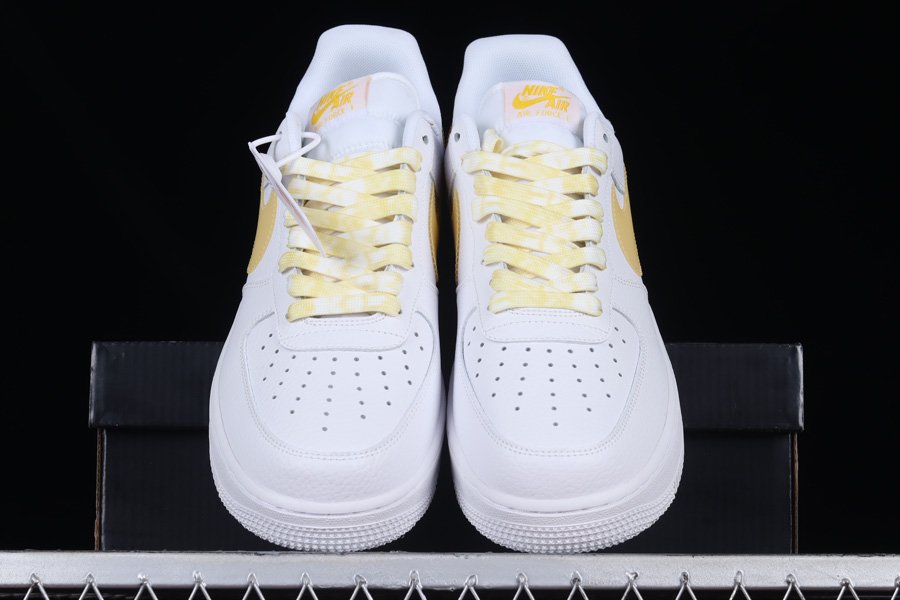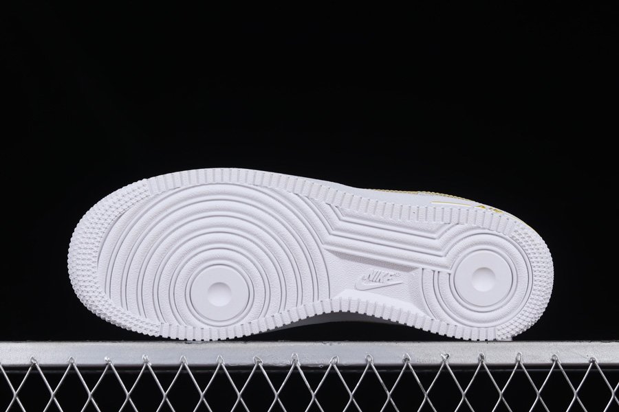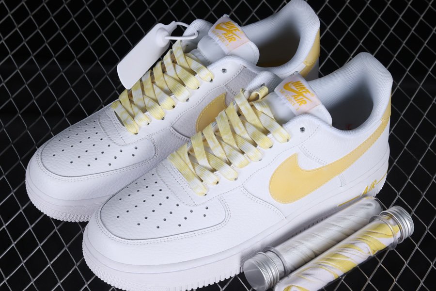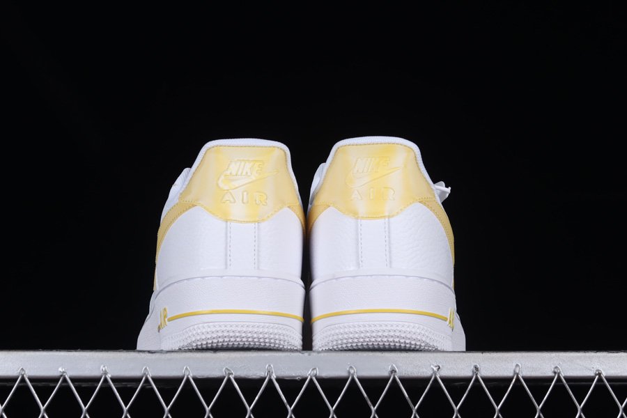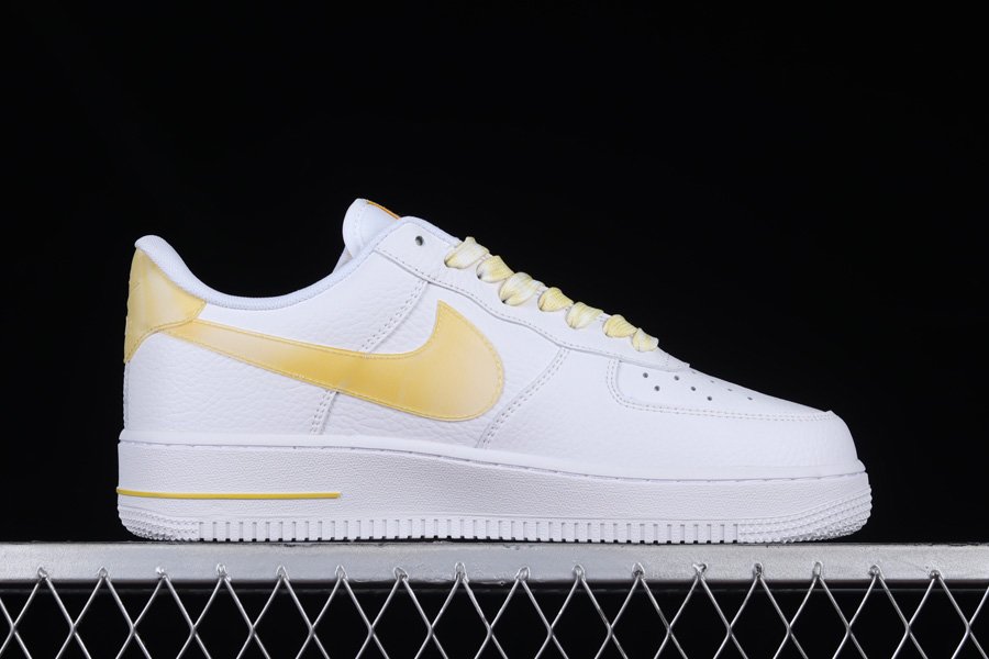 This iteration sees a yellow TPU Swoosh take over the sidewalls, fading from a very light yellow, to a darker hue. The heel panel follows suit in the same design, whilst the Air branding on the midsole stands out in lemon yellow. The rest of the AF-1 appears in white, with the tumbled leather adding a premium feel to the sneaker. White laces add a clean look to the shoe, whilst perforations across the toe box allow for enhanced breathability.