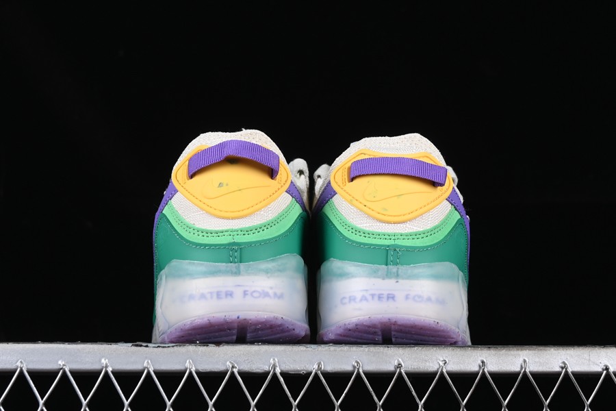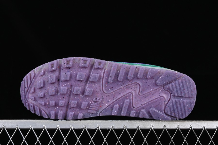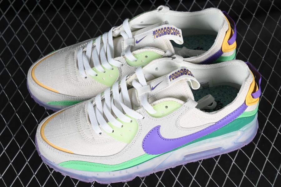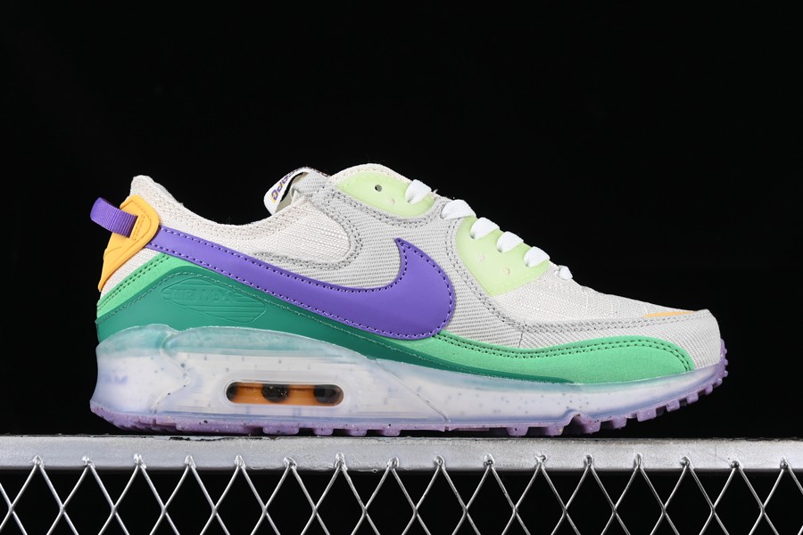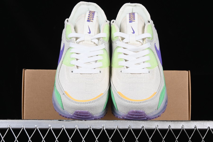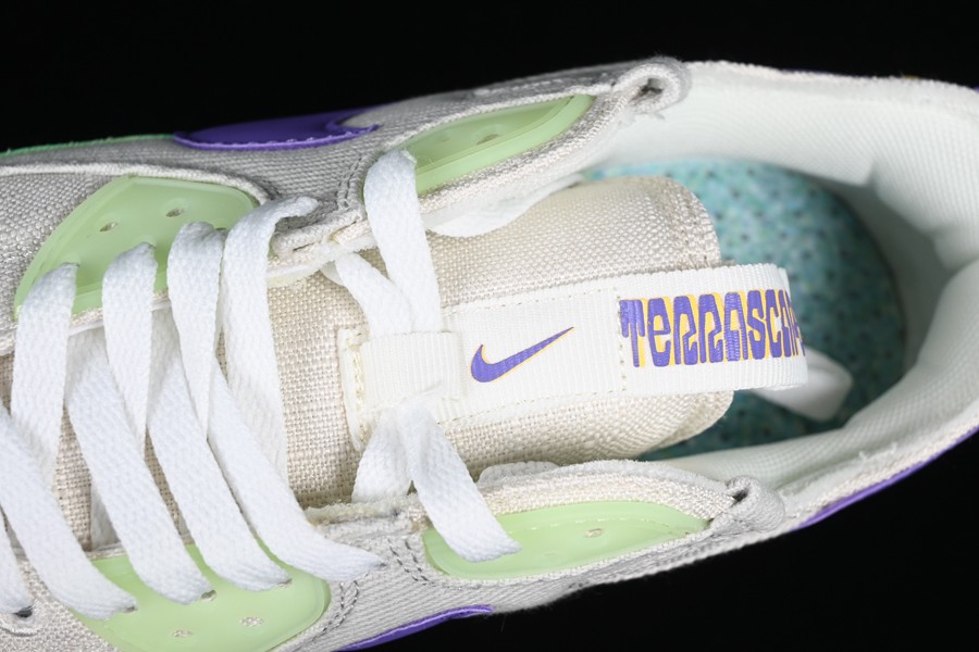 The AMT90 showcases a color scheme labeled as “Phantom/Action Grape/Light Bone.” The base of the shoe is anchored by a phantom grey canvas material, complemented by tonal twill overlays on the toe and mid-panels. Vibrant bursts of color, including green, purple, and yellow accents, adorn the eye stays, fabric, and plastic mudguards. At both the heel and toe, golden yellow tones frame the shoe. One of the standout features of the upper is the purple signature Swooshes, elegantly sweeping across both the medial and lateral mid-panels. To complete the look, a semi-translucent sole unit with exposed Air Max units at the heel adds a finishing touch to this sneaker’s style.