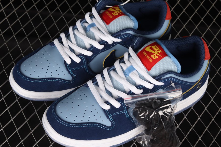 The Why So Sad? x Nike SB Dunk Low features a Light Blue leather base and mesh tongues paired up with Dark Blue tear-away overlays to reveal Yellow underneath. Other notable details include the embroidered skateboarding chicken motif on the lateral heel, the co-branded insoles with graphic of a bird doing a sad grab, “Why So Sad?” branding on the inner tongue tag, and question marks embroidered on the heels. Completing the look is a White midsole atop a translucent outsole.