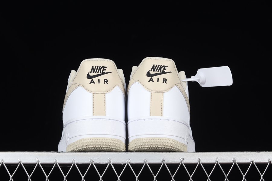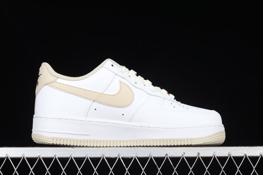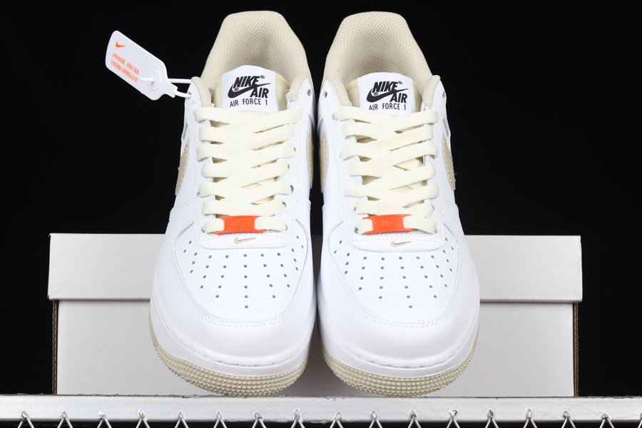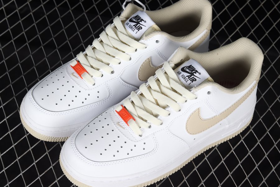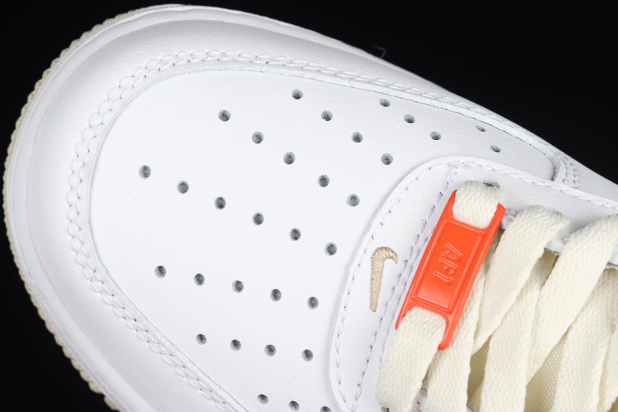 Sticking with its signature white leather base and overlays, this Nike Air Force 1 Low has been elevated with contrasting “Linen” accents seen on the profile Swoosh logos, tongue tab, heel, inner liner, and outsole. Final details include the bold orange lace dubraes.