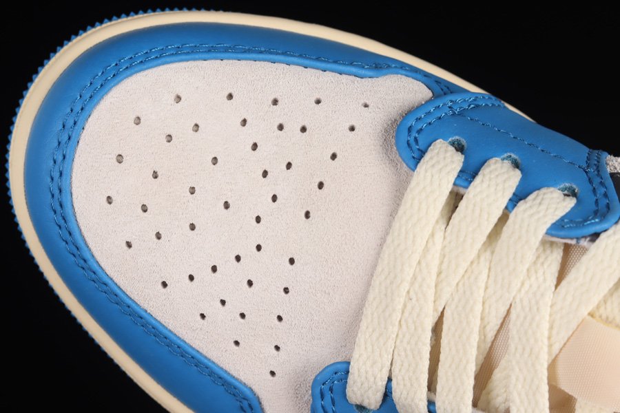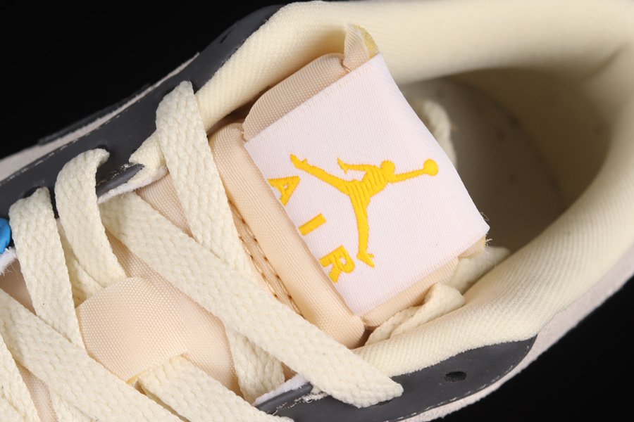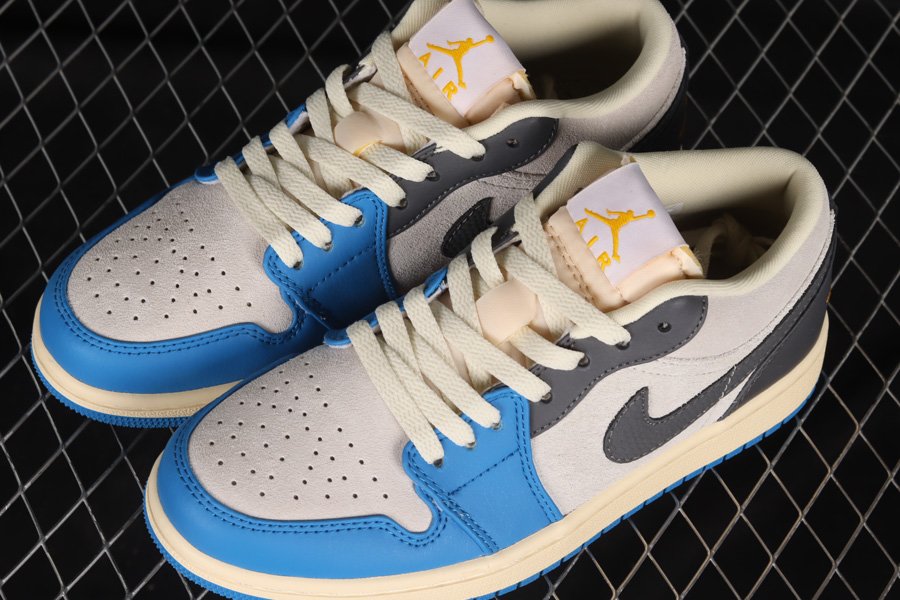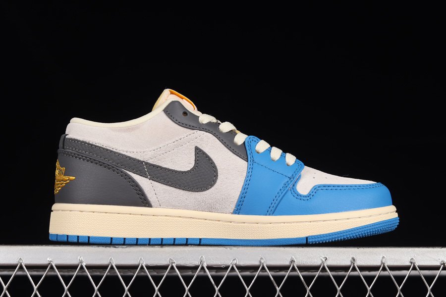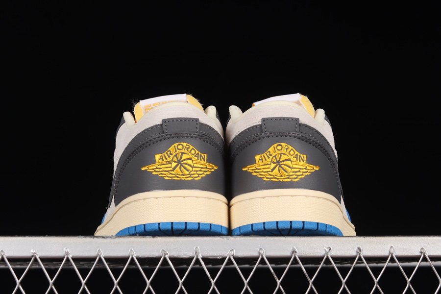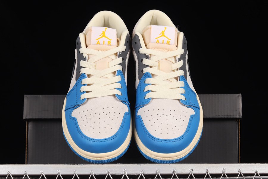 This low-top Air Jordan 1 comes dressed in a White, University Blue, Grey, and Sail color combination. Highlighted with White leather on the base and Blue on the overlays around the toe. Next, Grey adorns the Swoosh, heel, and part of the eyestay. This split look reminds us of the Union collaboration, but we also have an exposed padded tongue. Other details include a Yellow Wings logo on the heel, an aged midsole, and a Blue rubber outsole.