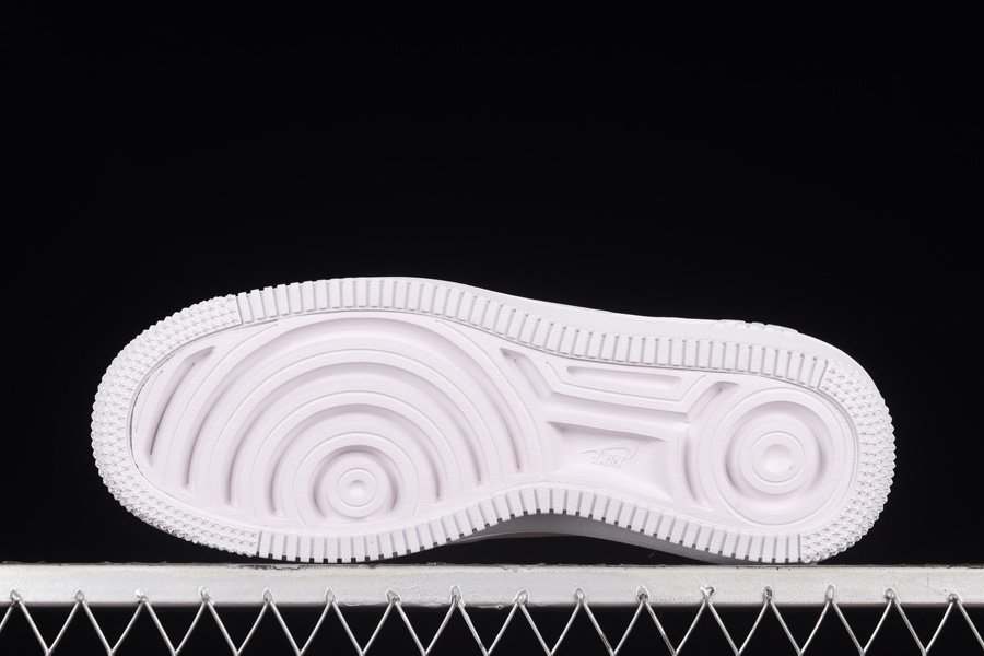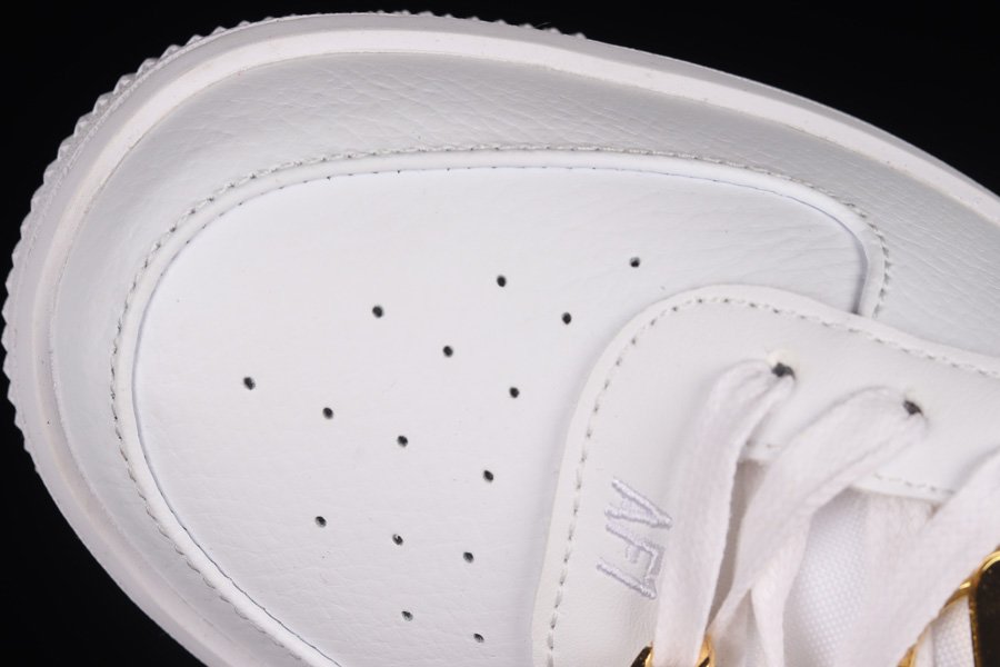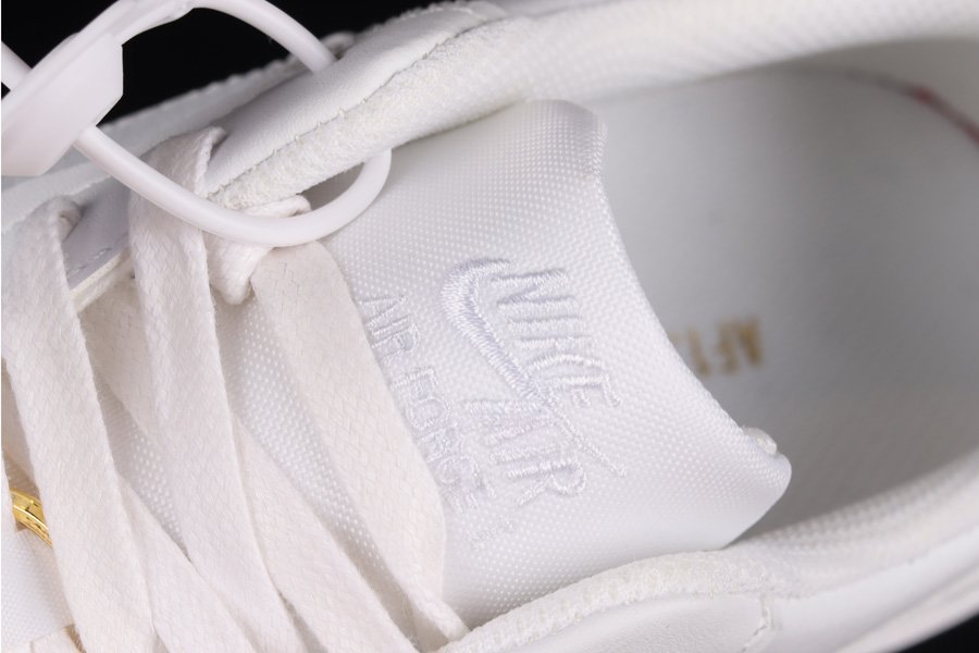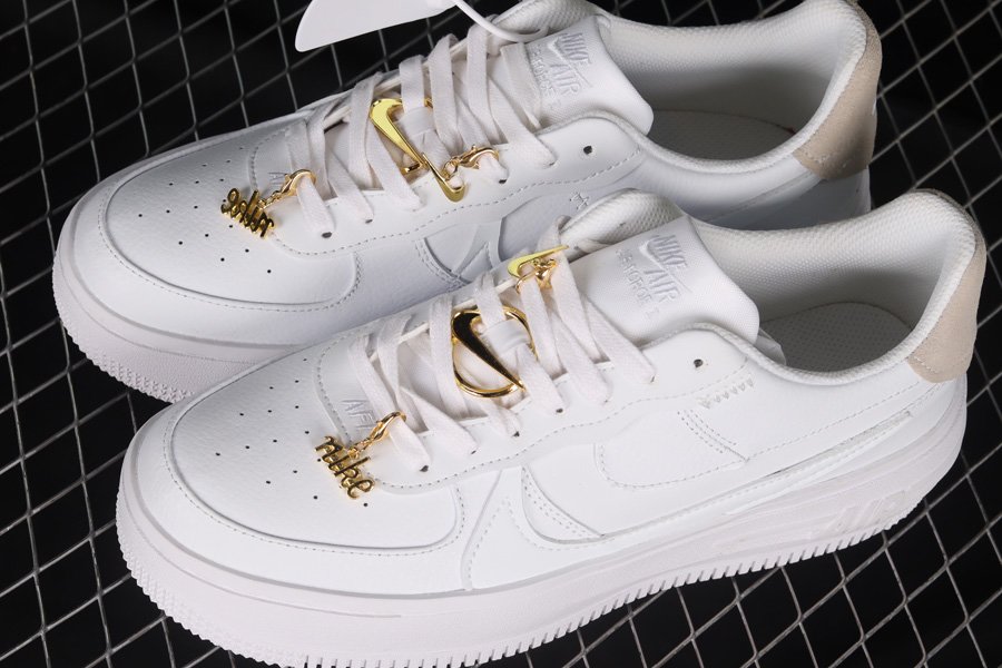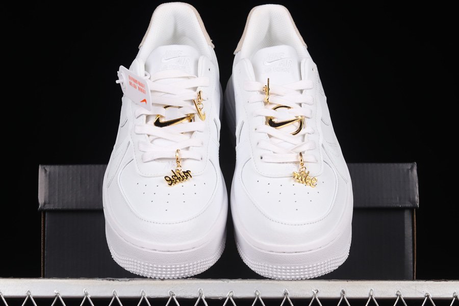 The Air Force 1 Low is presented in a pristine all-white leather upper, accented by a suede heel overlay. The standout feature of this shoe is the interchangeable gold Nike pendants, Swooshes, and ring bling, adding a touch of luxury. The design is finished with a solid white rubber sole, lending a sleek and refined look to the iconic sneaker.