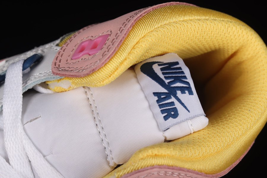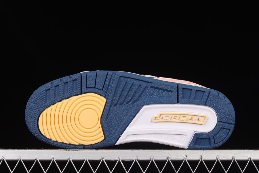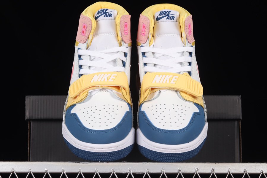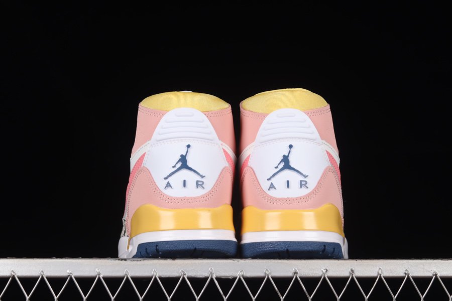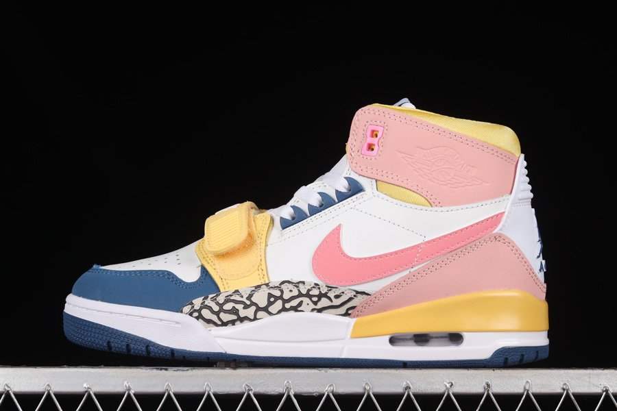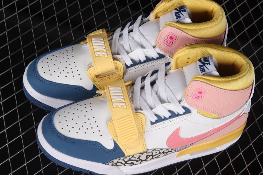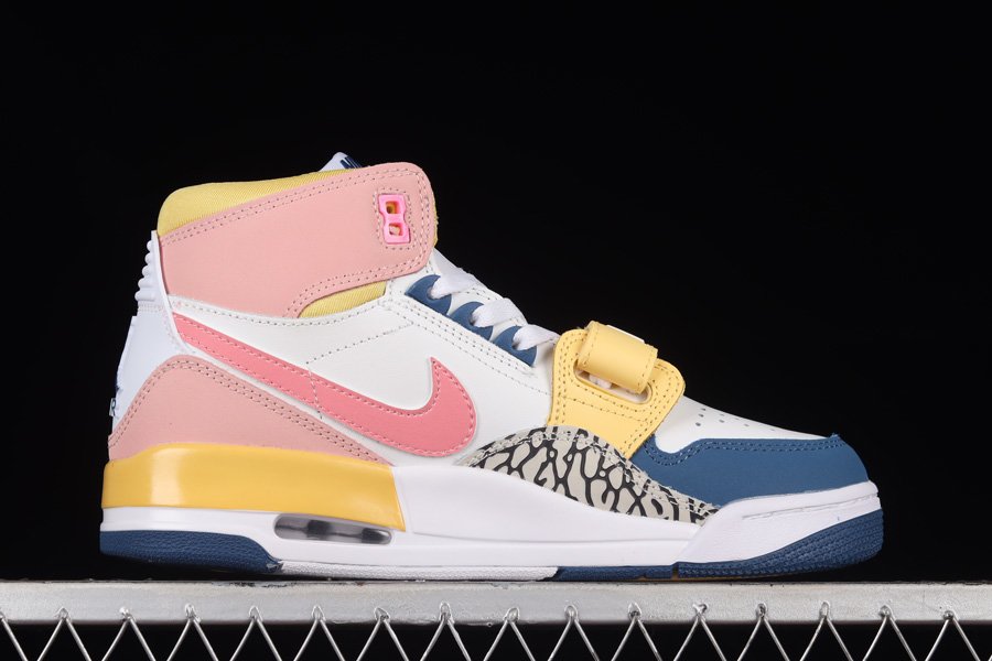 The Jordan Legacy 312 is a sneaker that seems better suited for Spring than Winter, with its various pastel hues. The design features bright pink suede accents on the ankle flaps and Swoosh, while blues add depth and interest on the toe cap and outsole. Light oranges also play a role in brightening the shoe, appearing on the strap, midsole, and collar. Overall, this combination of colors creates a vibrant and playful look for the shoe.