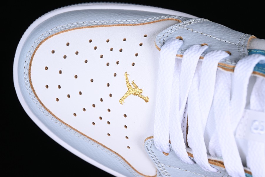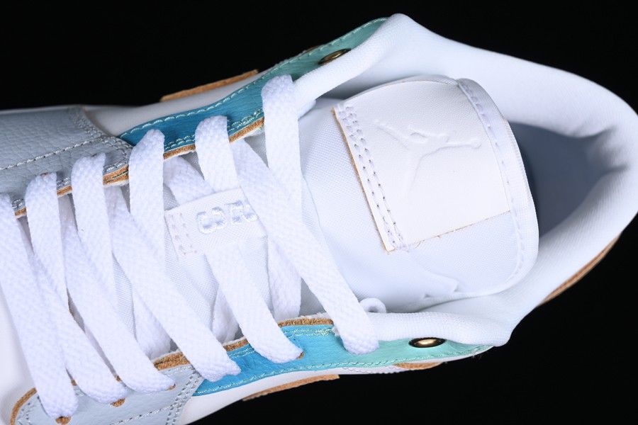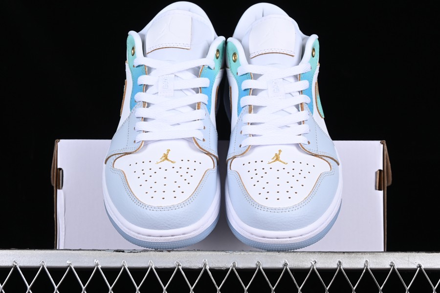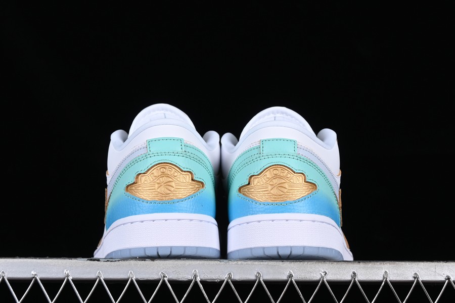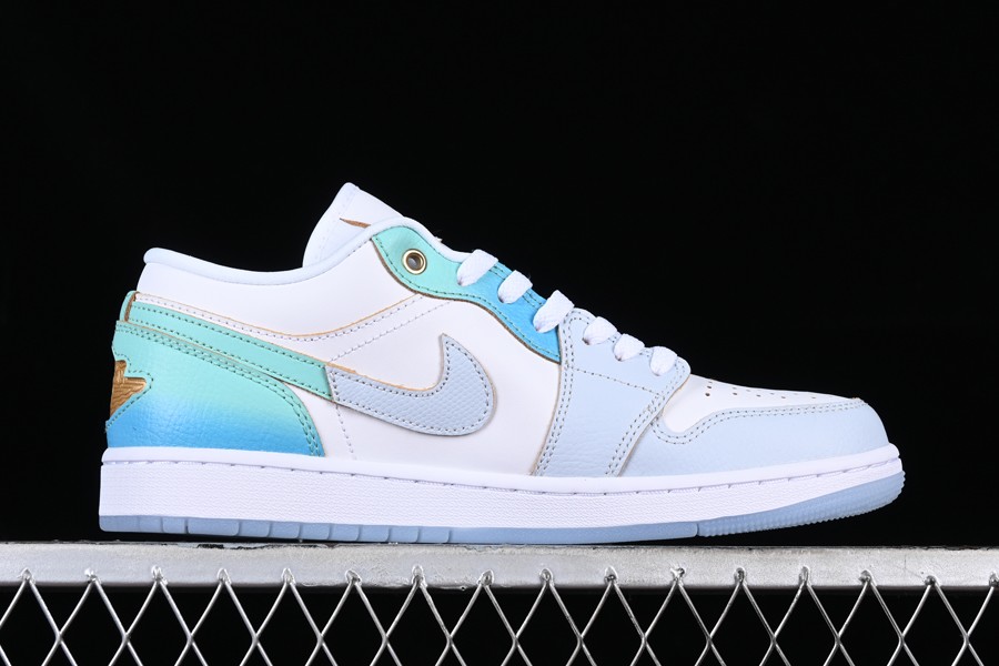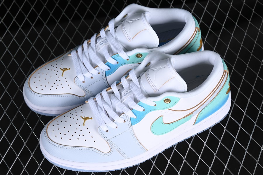Draped in a captivating palette of “White,” “Emerald Rise,” “Football Grey,” and “University Blue,” the Air Jordan 1 Low on display is a genuine visual delight. This sneaker seamlessly marries the elegance of smooth and textured leather, featuring mesh tongues and a plush sockliner. The foundation boasts a pristine “White” leather exterior accentuated by textured leather overlays. The eyestay and heel counter are adorned with a mesmerizing gradient effect that transitions gracefully from turquoise to mint. To complete the look, the sneaker is finalized with a crisp “White” midsole, an “Ice Blue” outsole, and the iconic Jumpman branding on the tongue and toebox in a striking combination of “White” and gold.
