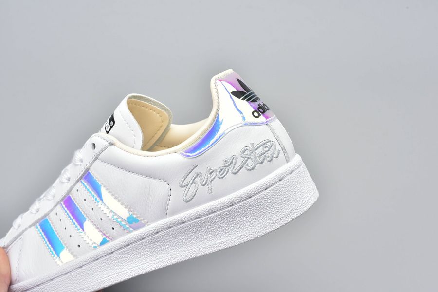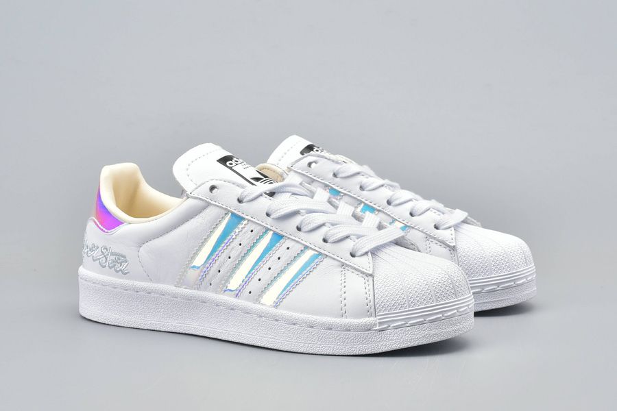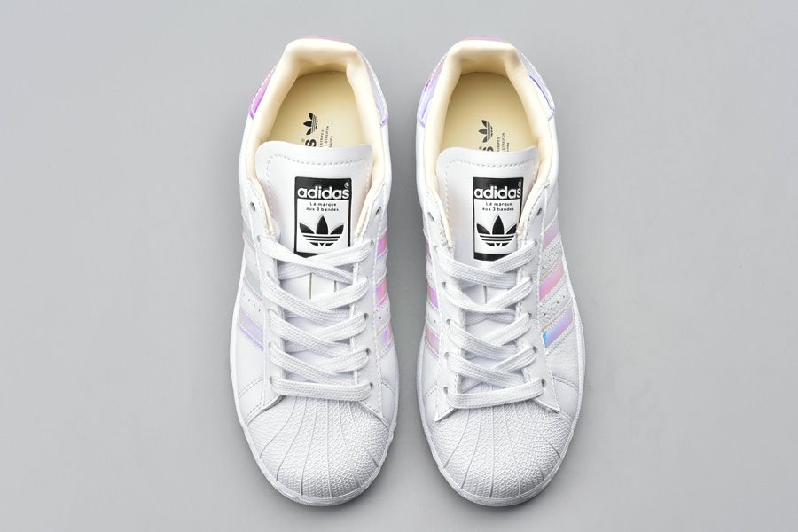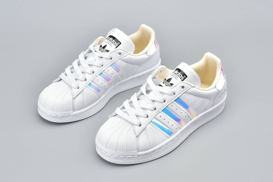 While much of their base is left a flat white leather like their most coveted editions, the Three Stripes have donned their accents with an iridescent finish. The shell toe staple adorns its profile logo hits as well as the heel counter in the maximalist swatch, shining in vibrant hints of purple and pink while the humble tennis shoe utilizes the motif much more sparingly, only adopting its exuberance along its rear.