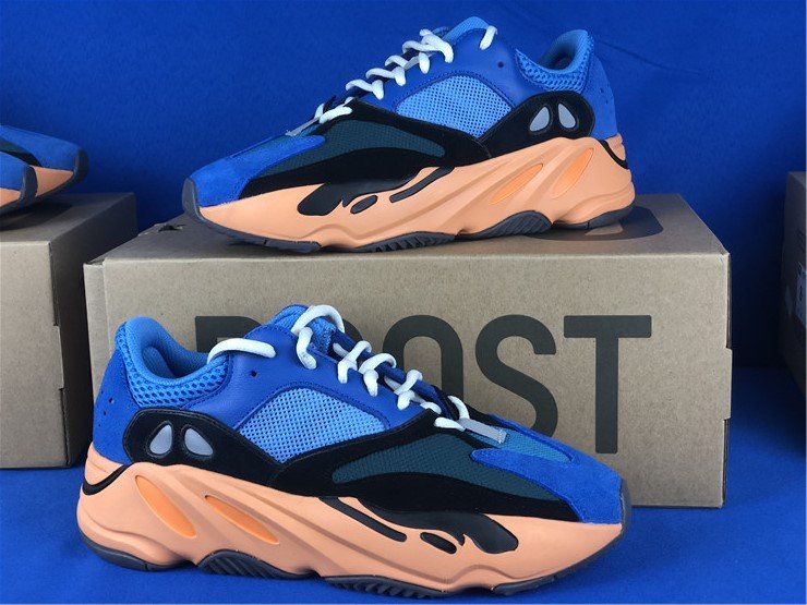 The adidas Yeezy Boost 700 “Bright Blue” flaunts Royal Blue uppers composed of suede and mesh panels, while contrasting black and green accents are also evident on the base. Finally, white laces and bold orange/black Boost-cushioned soles top off the design.