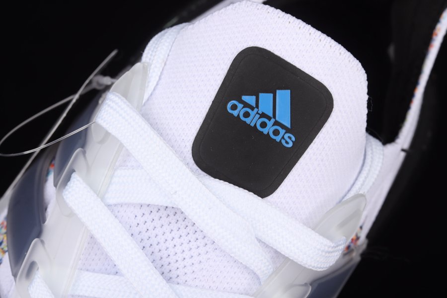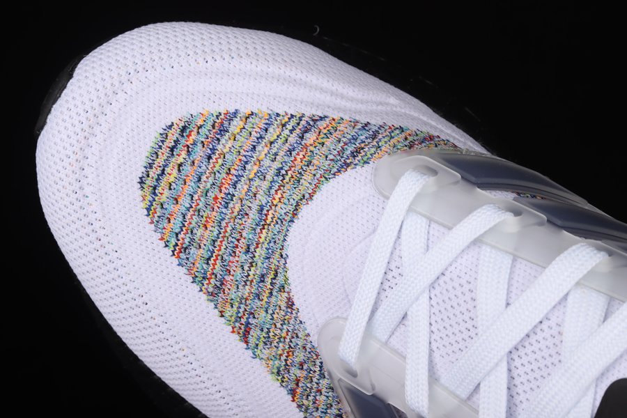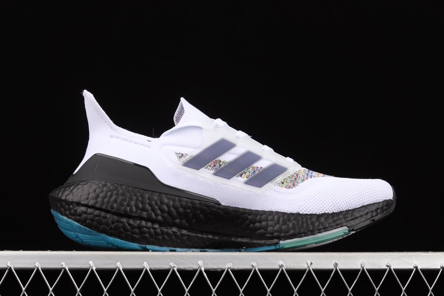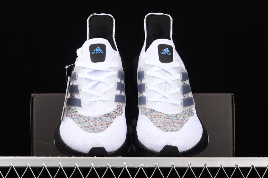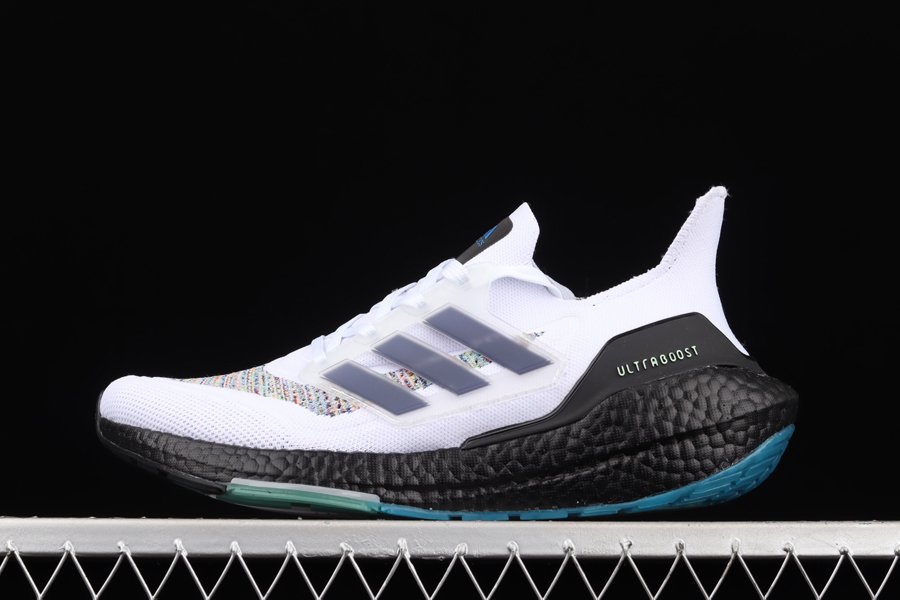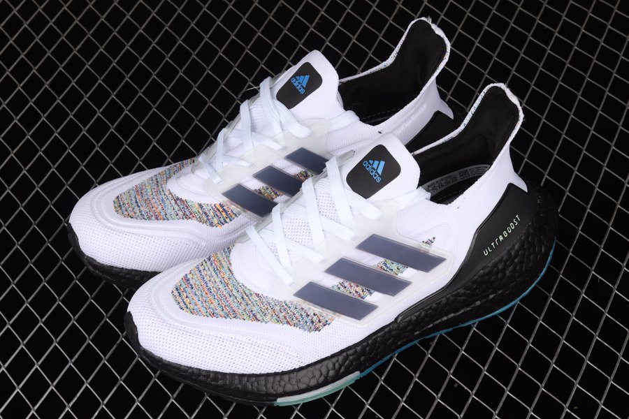The all-new adidas Ultra Boost 2021 is showcased in a new multi-color offering as this pair is sure to turn some heads. The latest and greatest from adidas running starts off with Primeblue on the upper, a high-performance recycled material made in part with Parley Ocean Plastic. 50% of the upper is textile, 75% of the textile is Primeblue yarn. This new colorway gets hit with an eye-catching multicolor weave construction all throughout the knitted upper with contrasting Black hitting the heel counter, tongue tag, inner liner, and the entire chunky Boost midsole. Blue and green detailing land on the tongue and heel counter branding as well as on the Continental rubber outsole to finish off the look on this adidas Ultra Boost 2021.