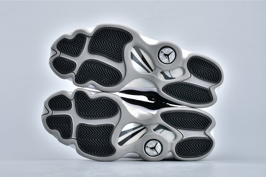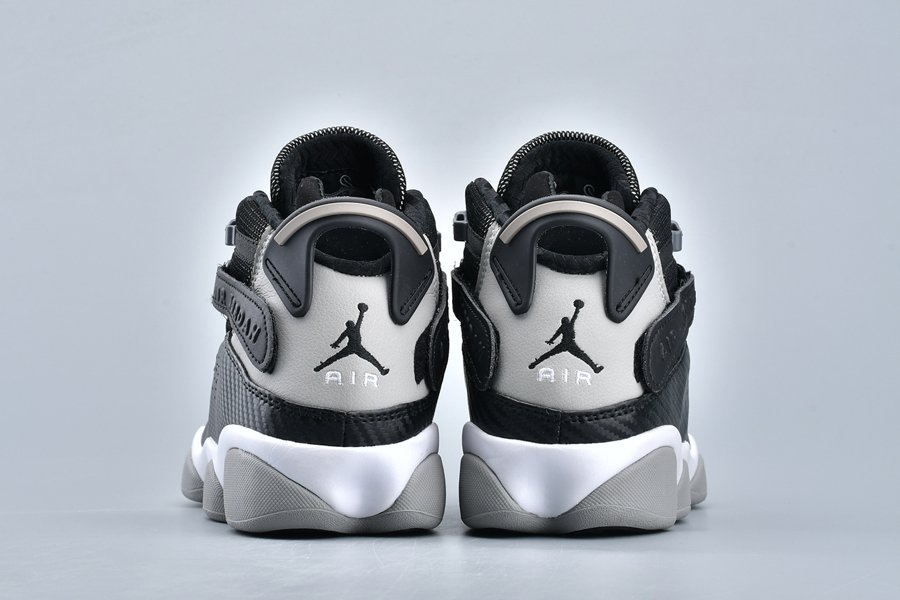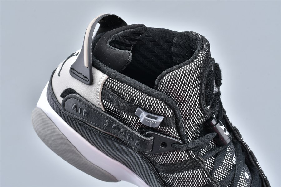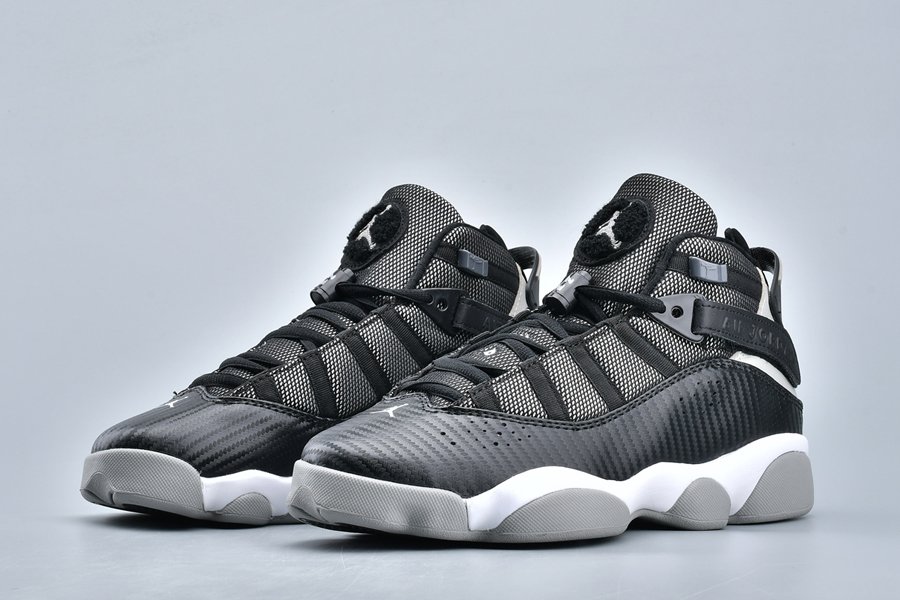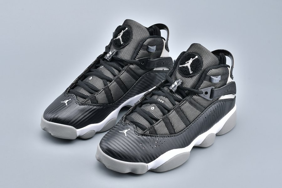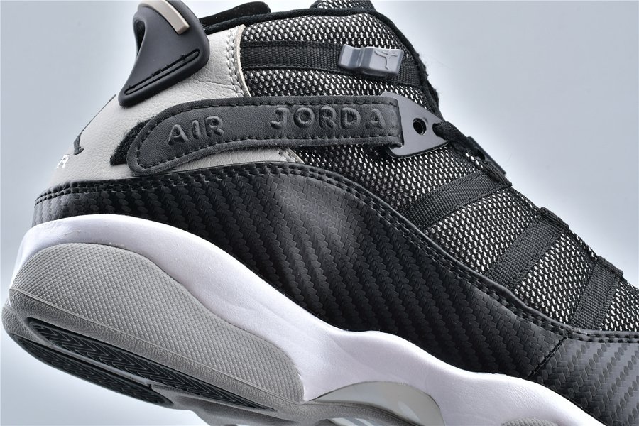 This hybrid Jordan Six Rings “Carbon Fiber” sports a synthetic carbon fiber weave throughout the upper, with medium grey leather wrapped around the heel. Jumpman branding and the midsole are done in white, while grey finishes off the heel tab, upper lace eyelet, pods and outsole.