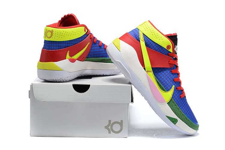 The KD 13 “NY vs. NY” is going to be very colorful. The upper is mostly blue, all while red is placed on the laces and back heel. From there, we have yellow on the Nike swoosh and cuff, with green being placed on the toe box, wrapping around to the sides. Finally, the midsole is white while the tongue is black.