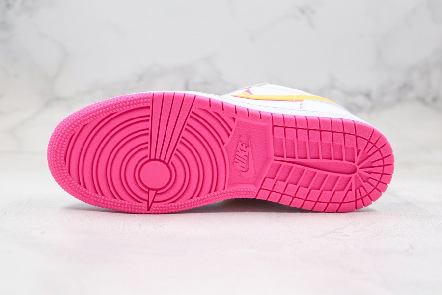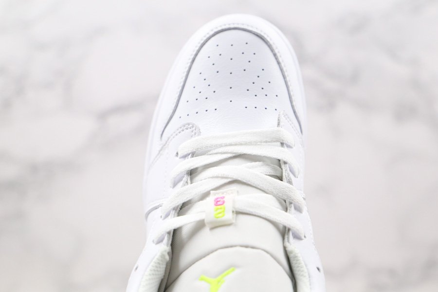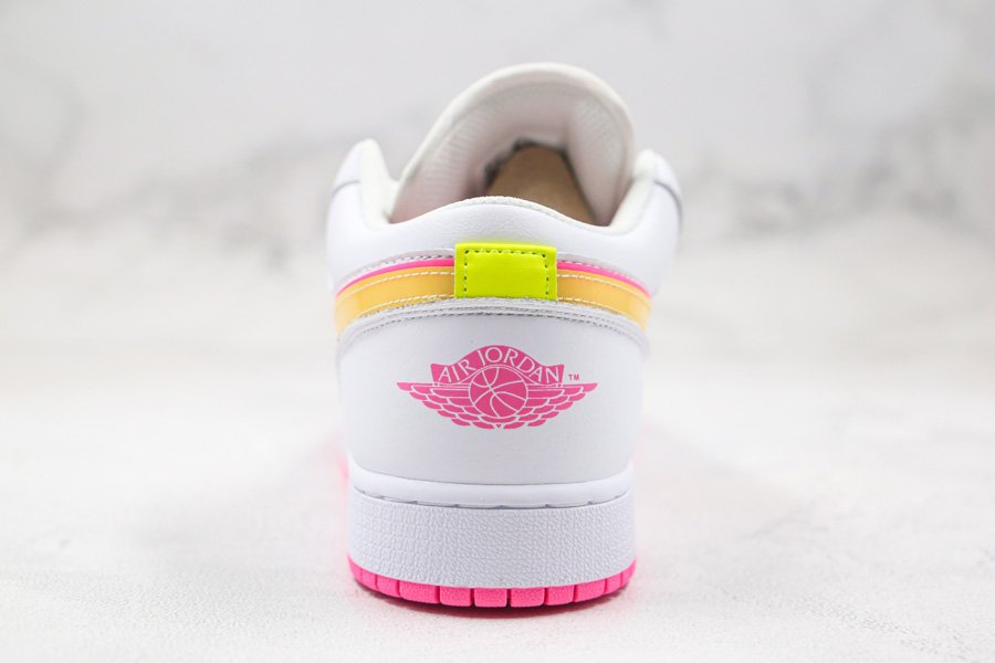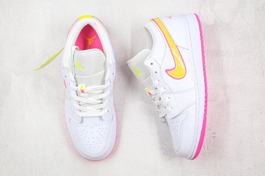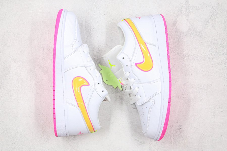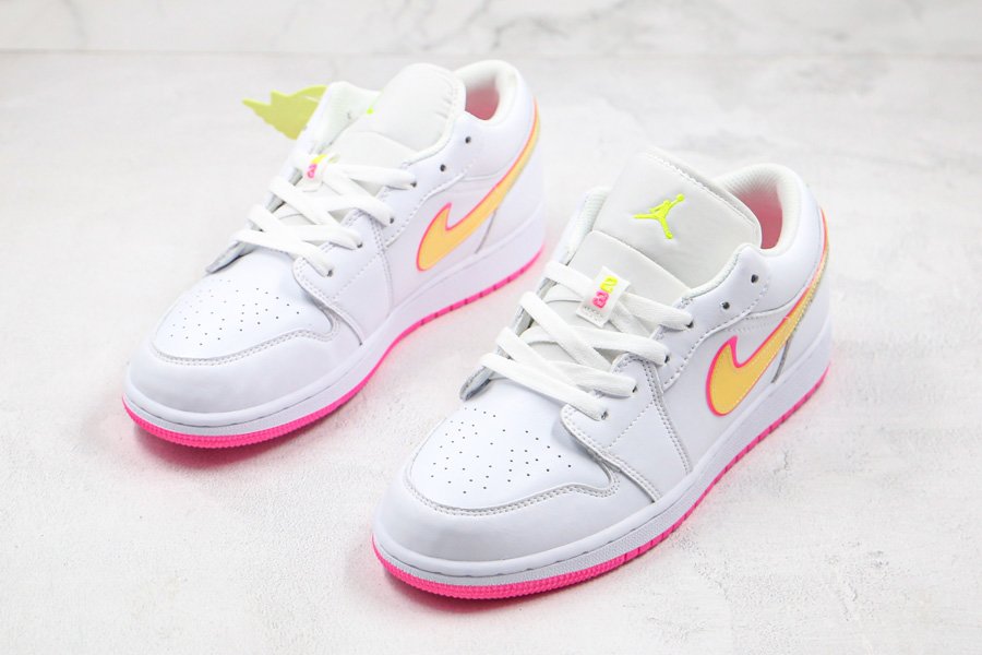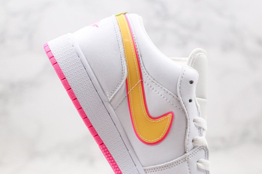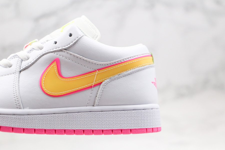 Clean and simple, the low-top boasts white leather uppers that are contrasted with yellow Swooshes outlined in pink. More pops of pink are visible throughout the shoe such as the wings logo on its heel tabs and rubber outsole. Finally, minor volt accents on the tongue and heel round out its design.