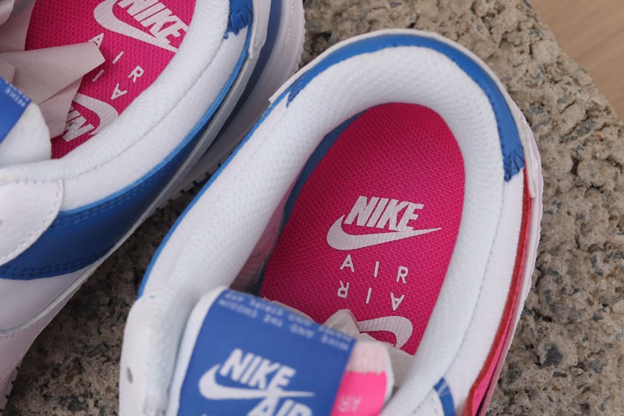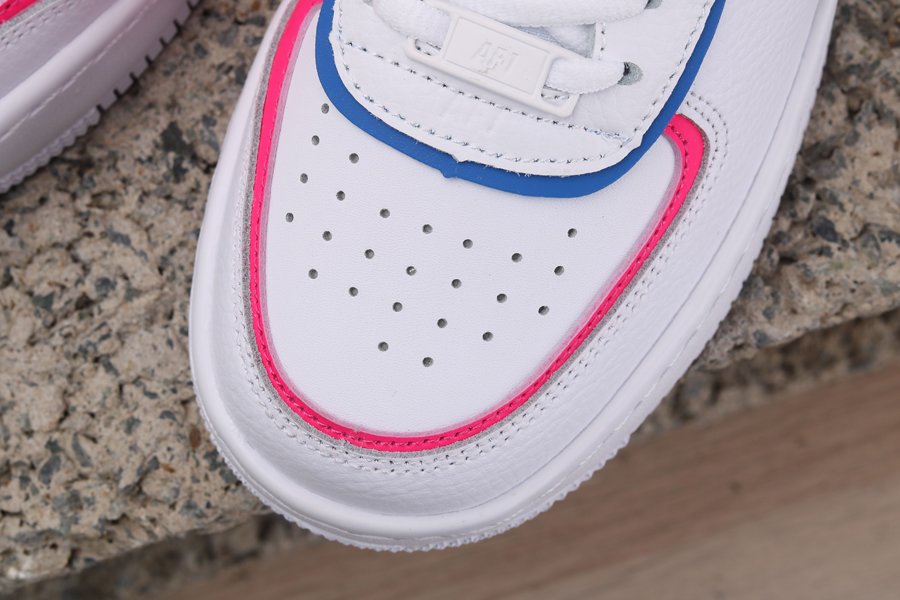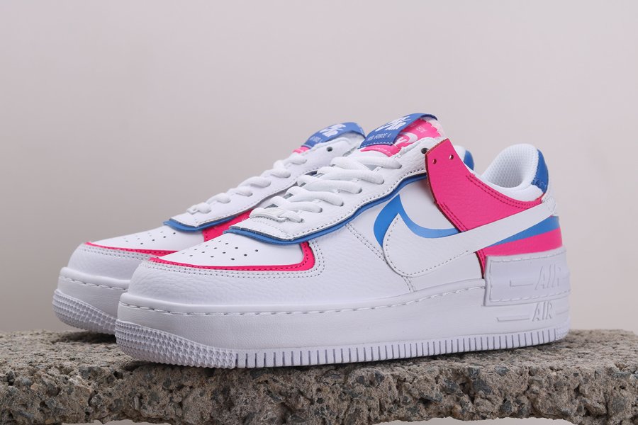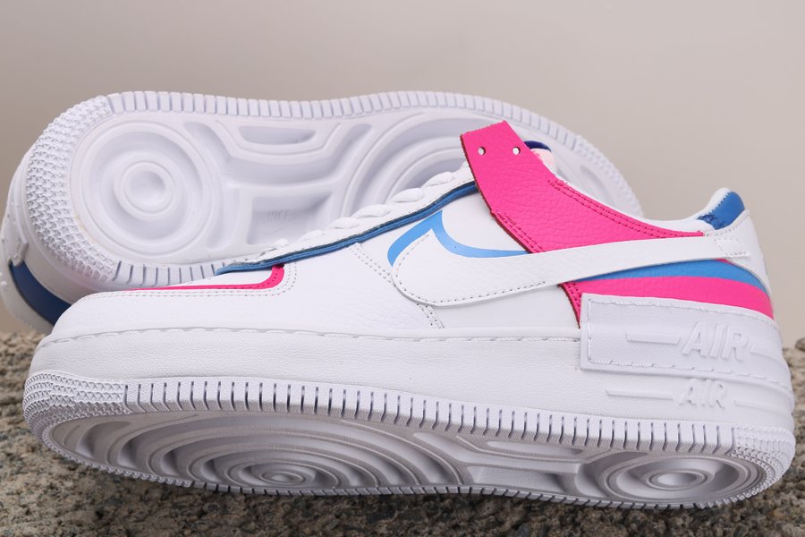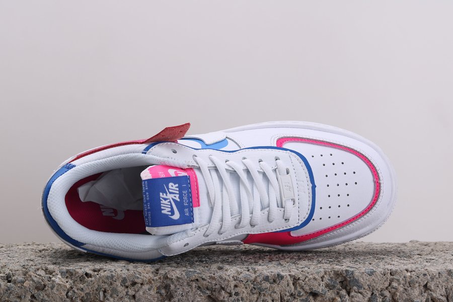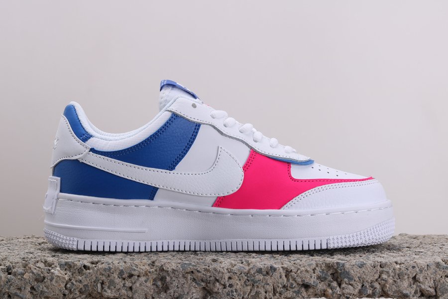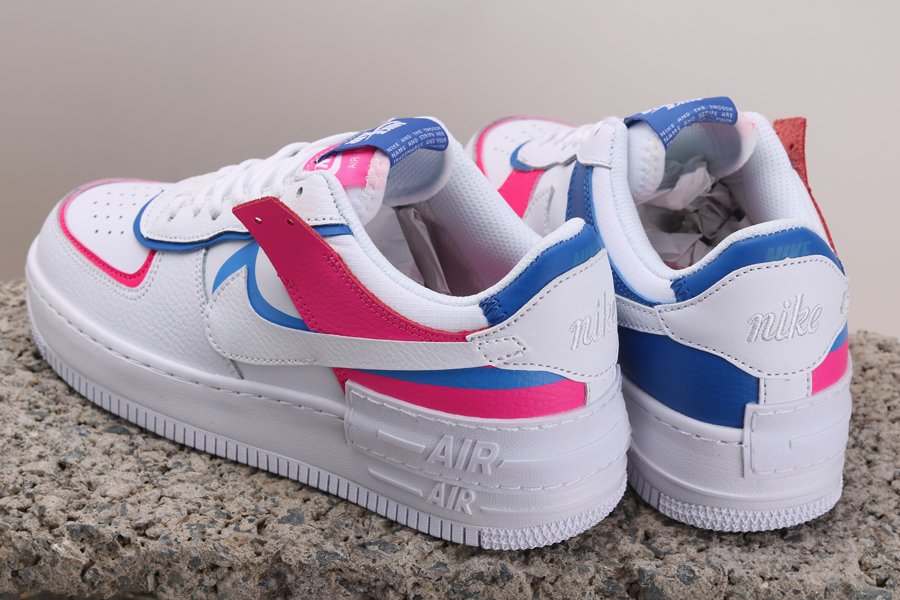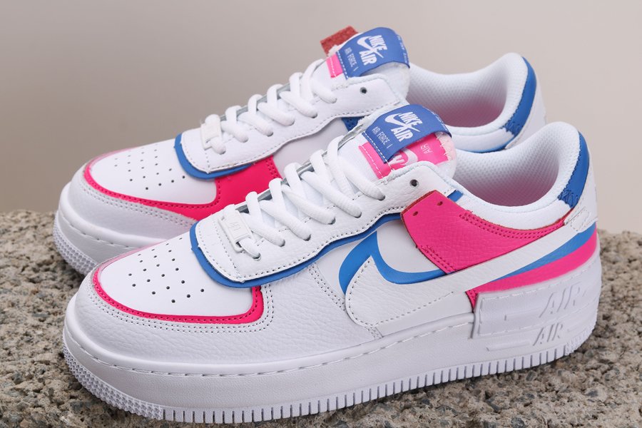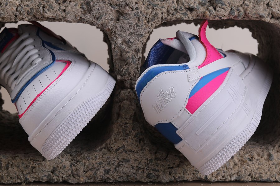 The interplay between the crisp white color and the deeper, fruity pink and blue tones – as well as the ways in which the colors are distributed across the layering of leathers – makes this AF-1 Shadow a force to be reckoned with – literally. Along with this perfect color pairing and blocking, feature-wise the low-top sneaker comes with an all-leather upper, branding on the tongue, Swoosh logos on the lateral sides, a padded collar, white rubber outsole, and a tight lace closure in white.