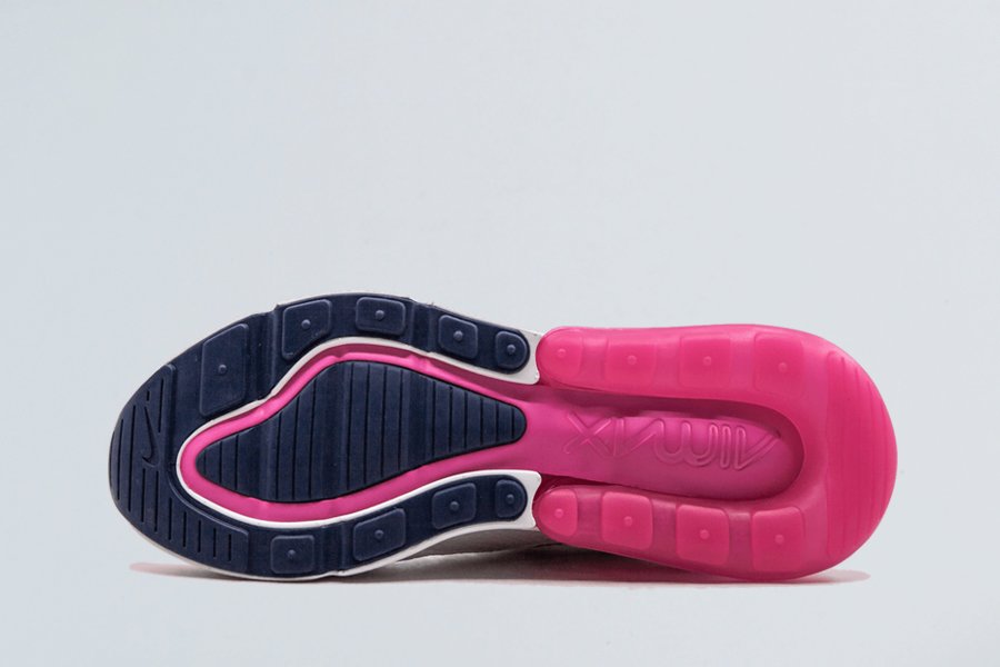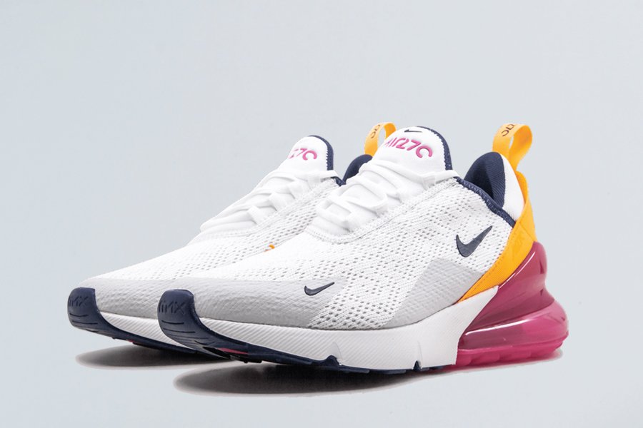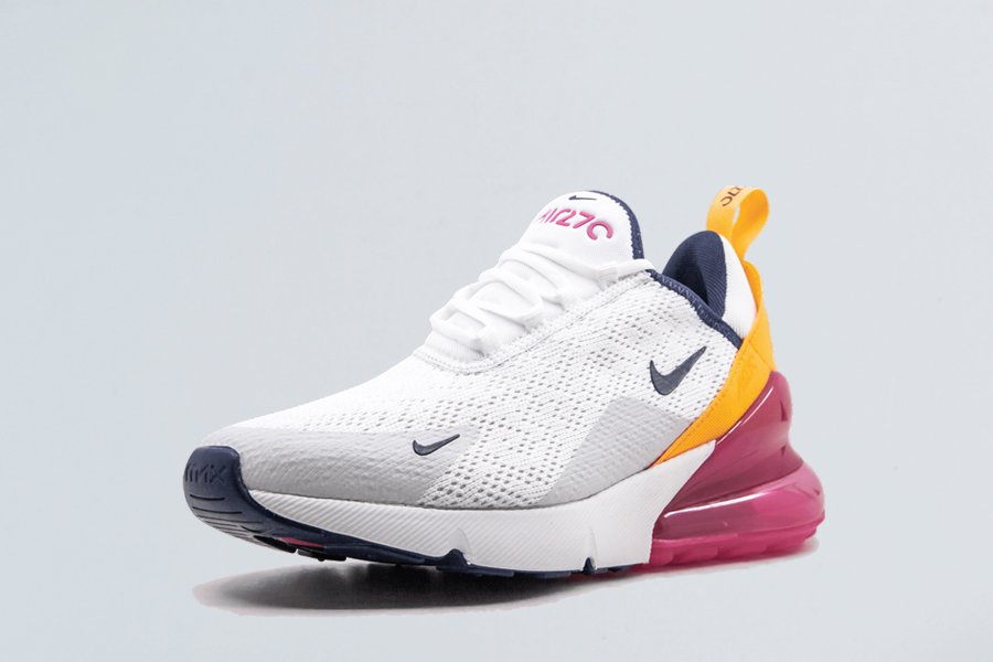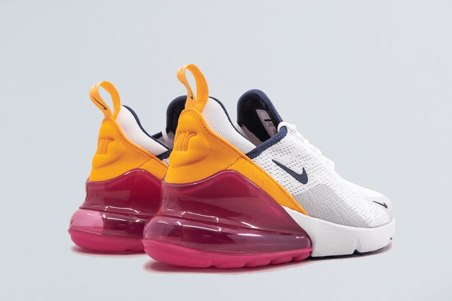 The Nike Air Max 270 women’s sneaker marked the first time Nike designed an Air Max style specifically for lifestyle wear. In recognition of the original Air Max 180, this shoe comes with an exaggerated tongue top, heritage logo, and the word “AIR” on the rubber toe tip. Anchored by a white mesh base, the heel becomes the focal point with a combination of fuchsia and golden yellow. Midnight navy tones are seen on the inner lining and outsole. The Nike Air Max 270 comes with Nike’s largest-ever visible heel air bag, which provides a super comfortable fit.