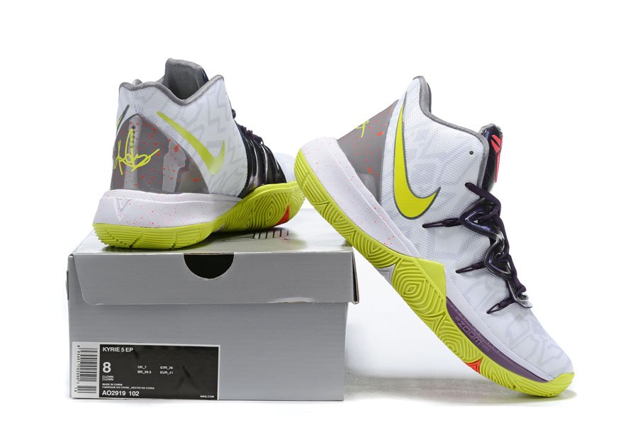The Nike Kyrie 5 Mamba Mentality is finally here and celebrates Mamba Day 2019. Covered in neutral-colored uppers with a hint of snakeskin detailing as a nod to Kobe Bryant’s alternate ego, the “Black Mamba,” the shoe is contrasted with hits of purple and neon green throughout, followed by red speckling on the heel and midsole as a tribute to the 2009 Joker-inspired “Chaos” Zoom Kobe 5.