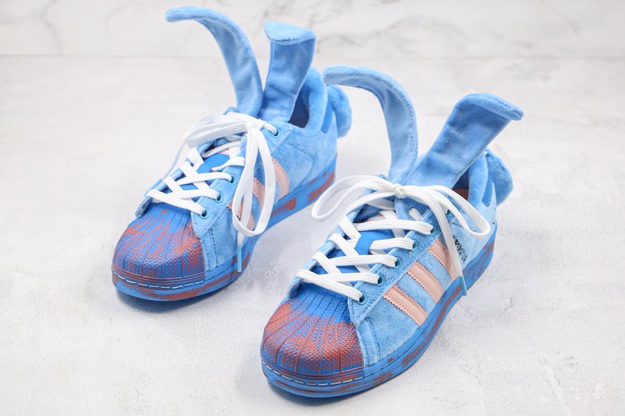 Bunny-mouthed embroideries dress the heel as a minimal, straightforward opener, grounding the motifs further elaborated on via the short scut tails attached to the counter and the pronounced ears that rest along the side of the lace unit. Elsewhere, faux furs are doused in a bright blue all throughout, matched by darker leathers atop the tongue and heel tab; side profiles are then accented further with a natural tan as the Three Stripes layer atop in complement to the tongue and insole. Below, the sole finishes with distressing, the side walls and shell toe brushed with brown all across.