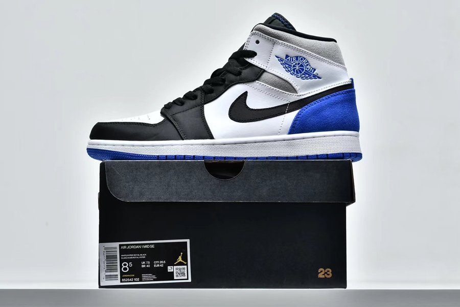 This Air Jordan 1 Mid featured a white leather upper on the toes, side paneling, and ankles. Black is then used on the forefoot overlays and Nike Swoosh while Royal Blue paints the heel adding just the right amount of Fragment aesthetic. Grey shines on the ankles slightly for a perfect amount of contrast. A white rubber midsole and blue outsole then complete the sleek design.