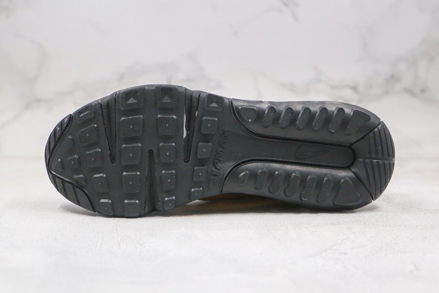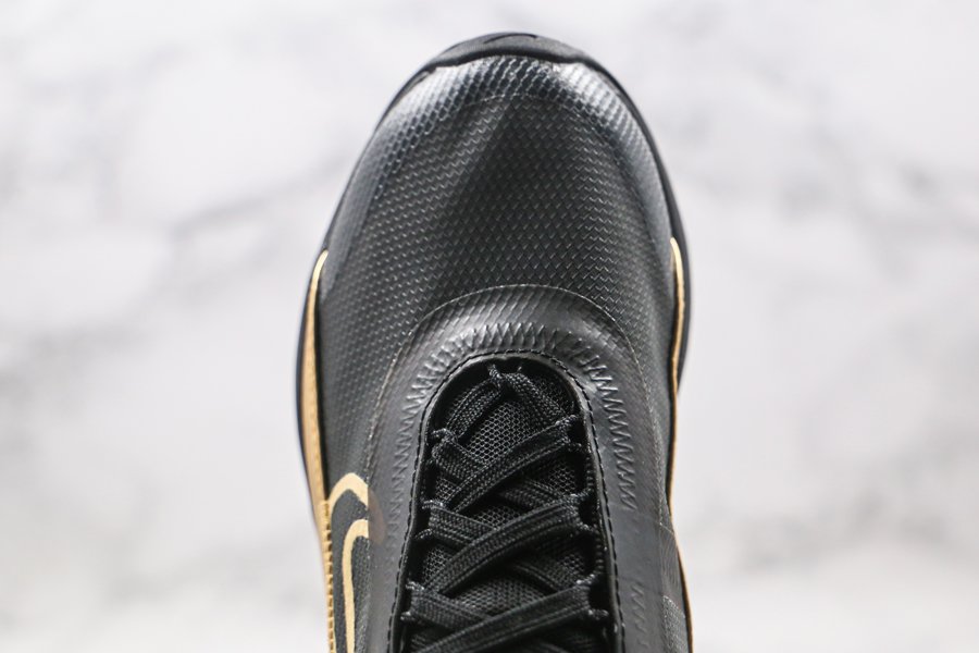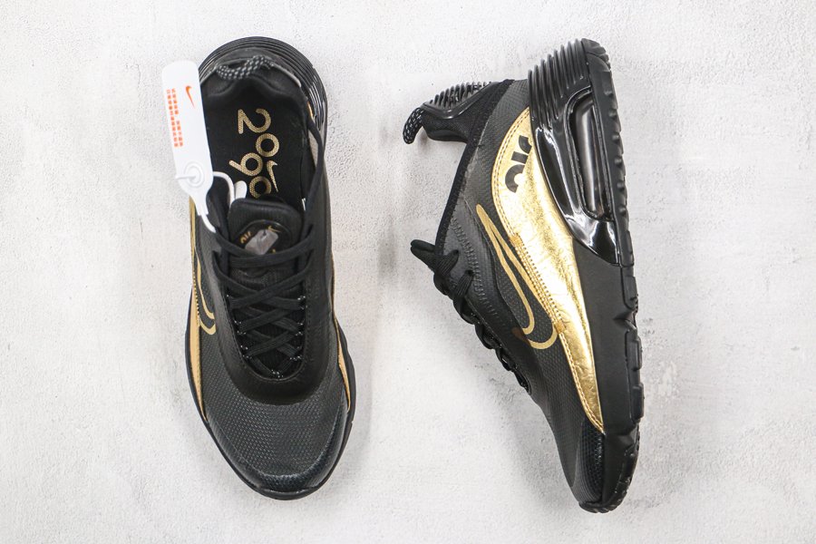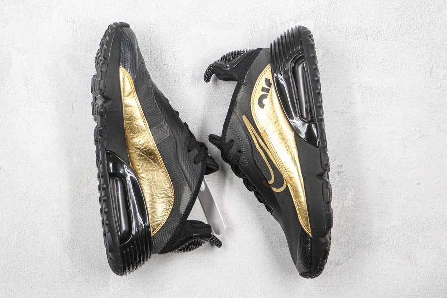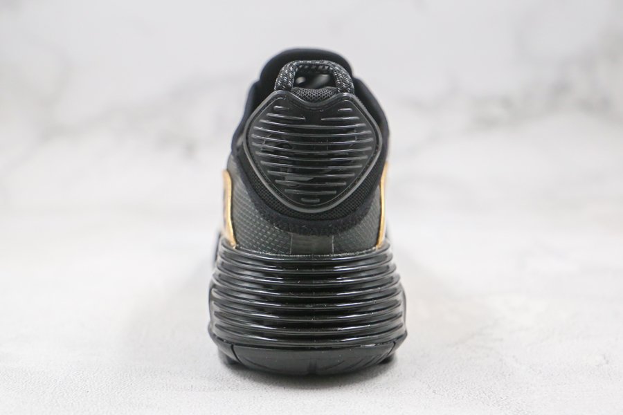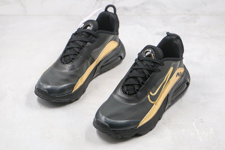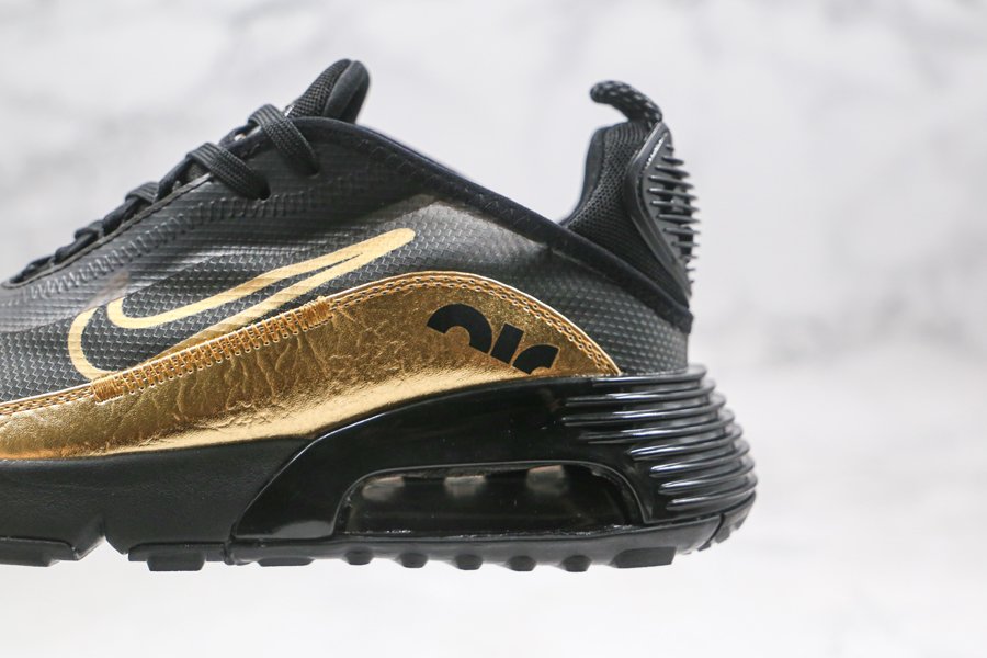 Keeping things crisp and clean on the upper, this Nike Air Max 2090 starts off with a Black upper contrasted by the Metallic Gold foil hits on the mudguards. Other hits of Gold are noted on the branding found on the outline Swoosh, tongues, and insoles. Completing the look is a Gold Swoosh lace dubrae atop a Black rubber sole.