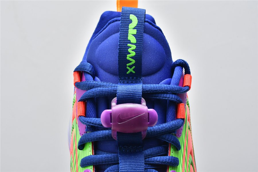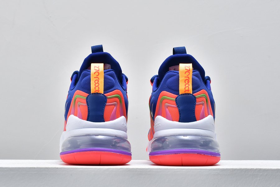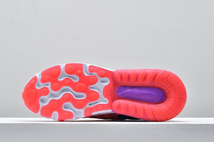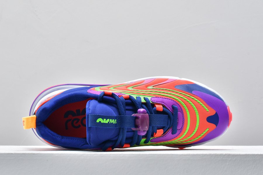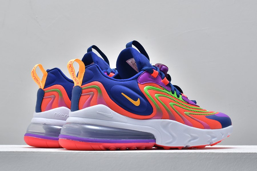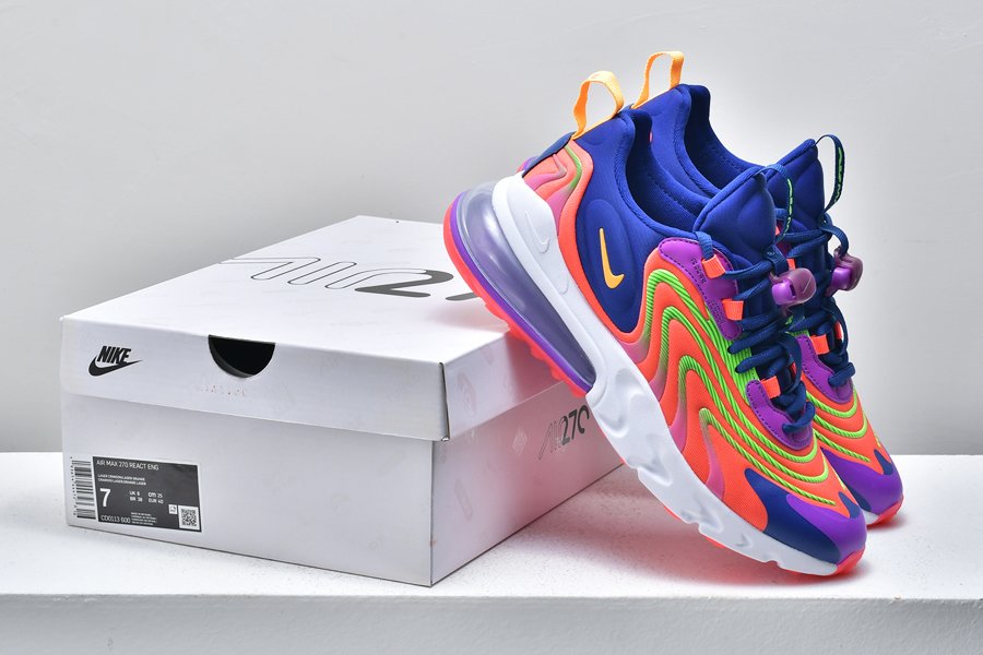 The Nike Air Max 270 React ENG “Laser Crimson” boasts a mesh construction on a large portion of the upper which is then offset by wavy curved plastic lines on the toe, side panels, and heel in a lime/orange gradient. Contrasting blue is also placed on the tongue, collar area and toe cap, alongside purple accents throughout. Finishing details include a new lace lock, a white React midsole with a translucent Air Max 270 heel unit, and a pink rubber outsole.