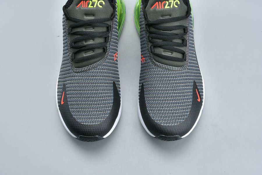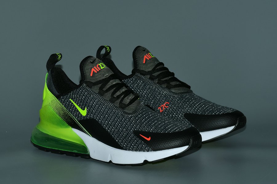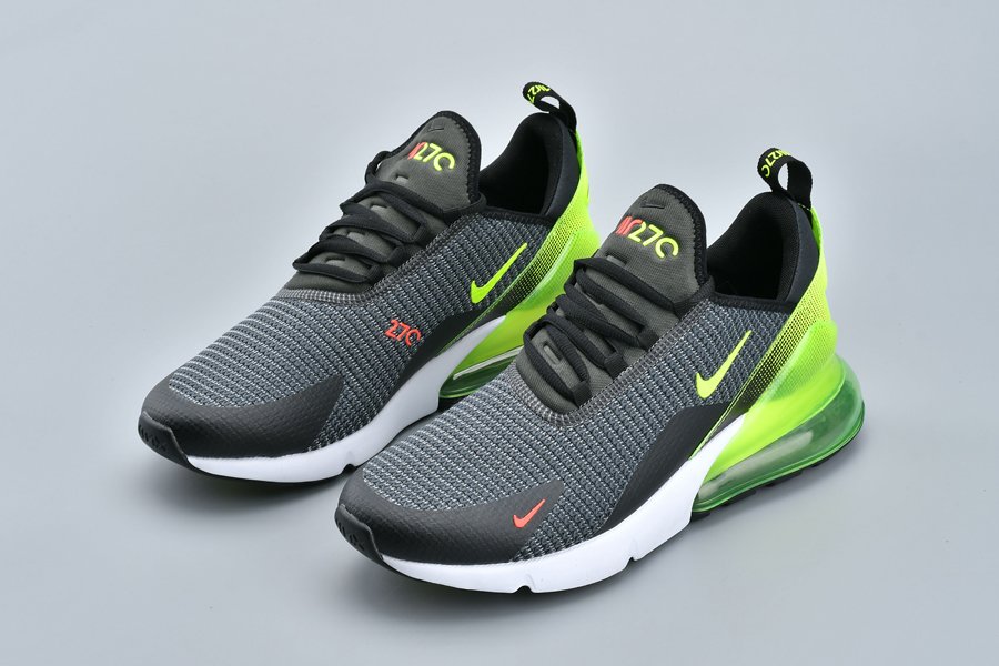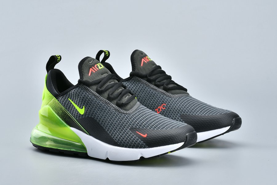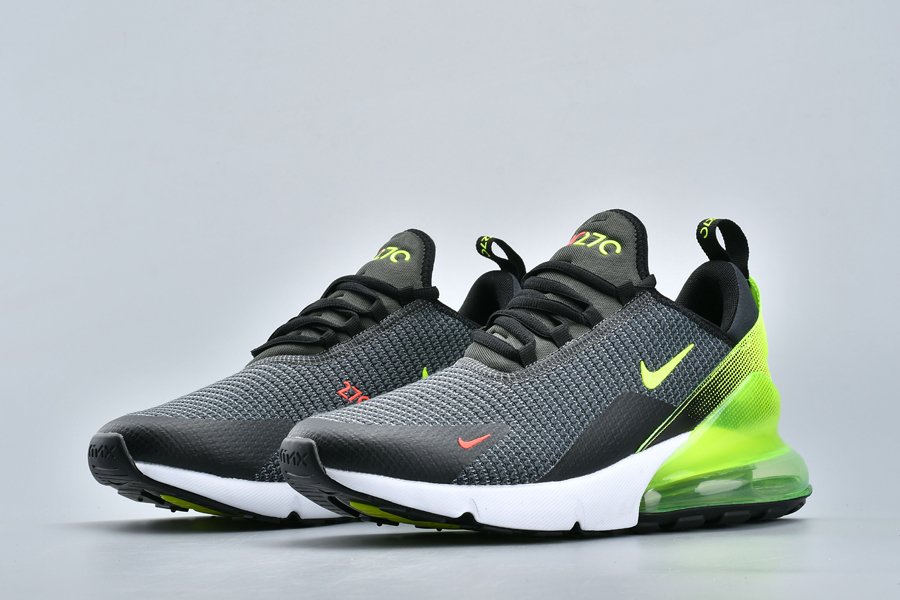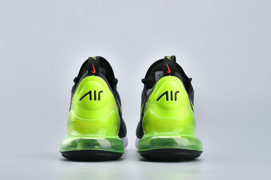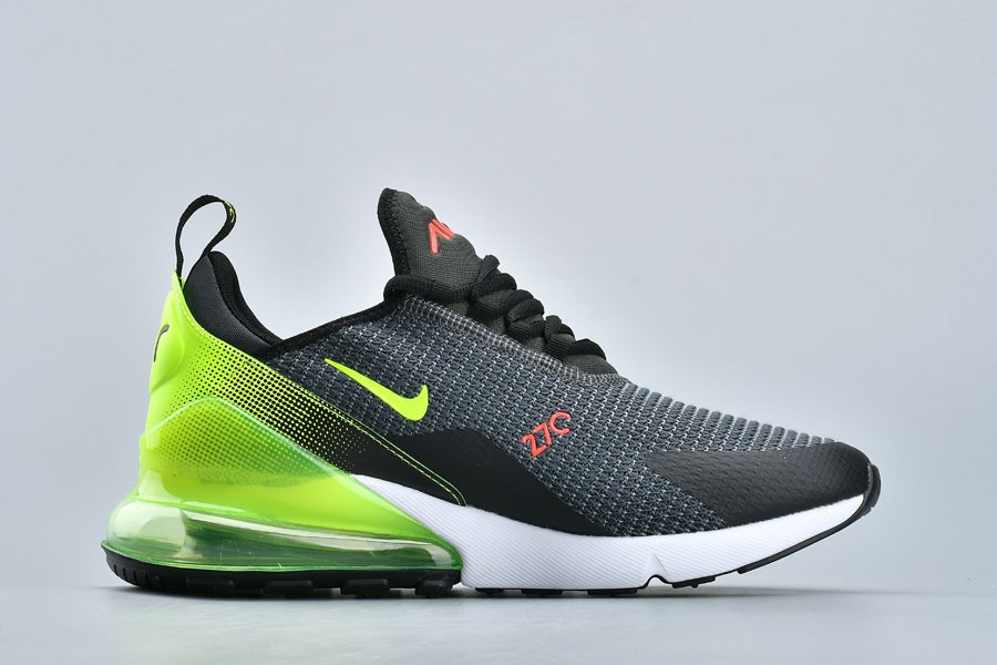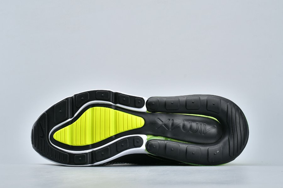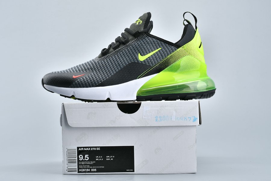 Taking elements of the original 1991 Air Max 180 with its exaggerated tongue top and heritage tongue logo, the Air Max 270 Black Volt features a mesh upper that features the AM270 logo repeated all over. Down below, a foam midsole is present, followed by a glossy rainbow coloured Air unit which sits around the heel for additional comfort and a smoother stride.