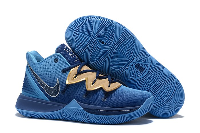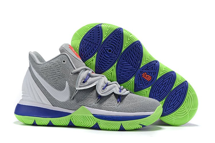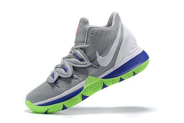 This Nike Kyrie 5 sports a grey mesh upper, tonal shroud covering the laces, white heel overlay, and white Swoosh branding on each side panel. A red Kyrie logo and signature are stamped on each tongue. The pair sits atop a “Sprite”-esque blue and lime green sole. Special graphics are emblazoned on each insole as well.
