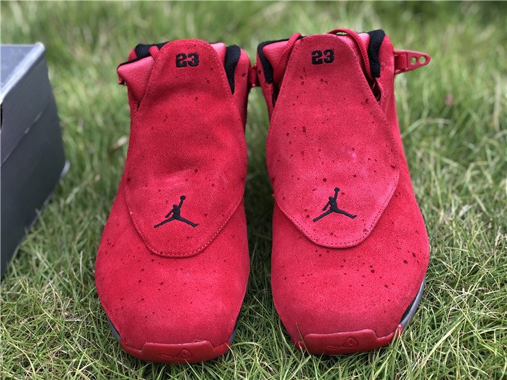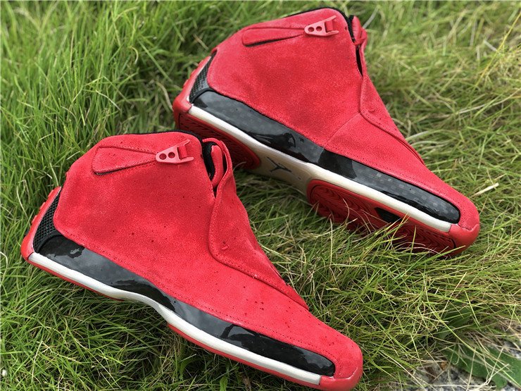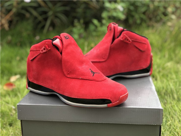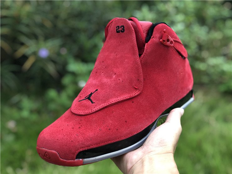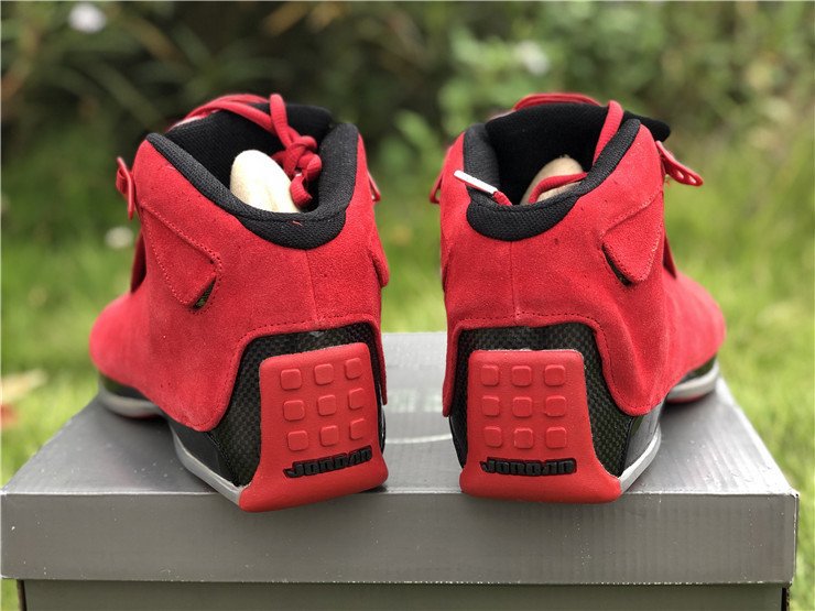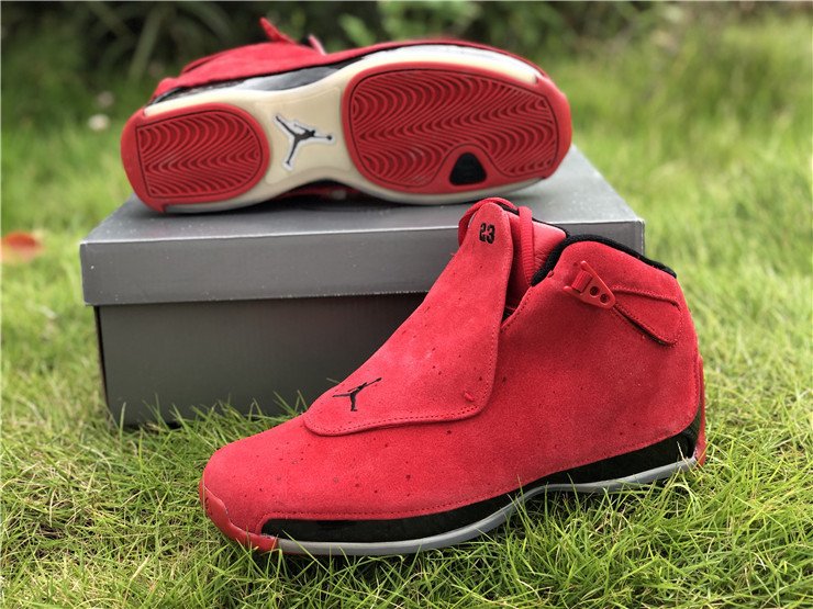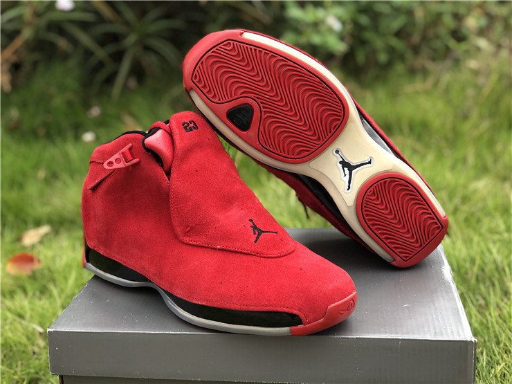 The Air Jordan 18 Retro Toro is a new colorway celebrating the last sneaker Michael Jordan ever wore on an NBA court. The sneaker is covered in the popular Bred color scheme as premium red suede covers the entire upper. Black accents are seen on the lining, midsole, and mini Jumpman on the removable red shroud covering the lacing, with an an icy translucent outsole bringing the design altogether.