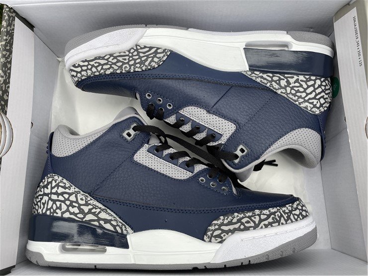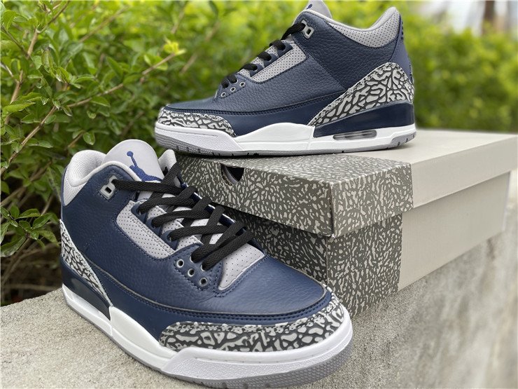 The Air Jordan 3 Retro ‘Georgetown’ is the latest variation of a timeless silhouette. It features a Midnight Navy tumbled leather base with Cement Grey overlays on the toe cap and heel. A White midsole and a signature Grey colored rubber sole finishes off this release. Order today to guarantee your pair.