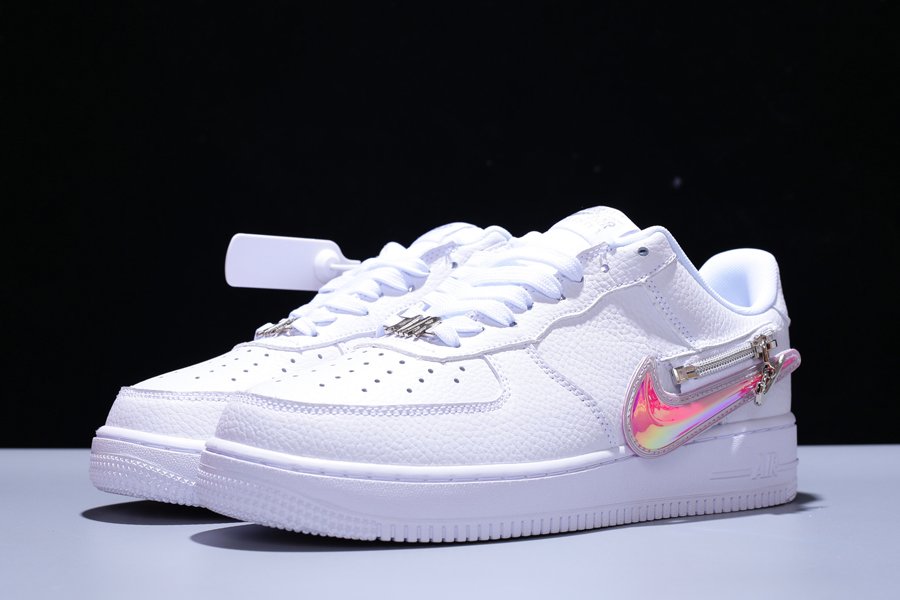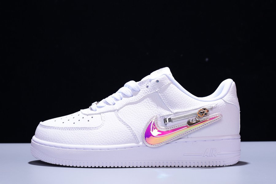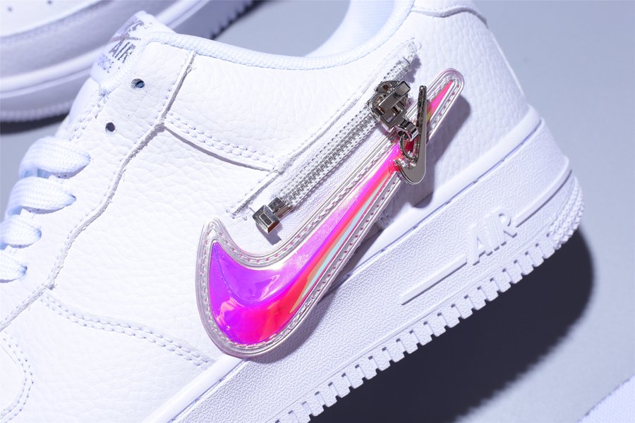 Coming in the low top variety, this Air Force 1 is highlighted by zippers on the lateral side panels that are attached to iridescent Swooshes that run down to the midsole. Silver Nike branding on the tongue and heels, black Swooshes on the medial side panels, and silver “AIR” lace dubraes round out the look on this Air Force 1 that will be releasing soon.