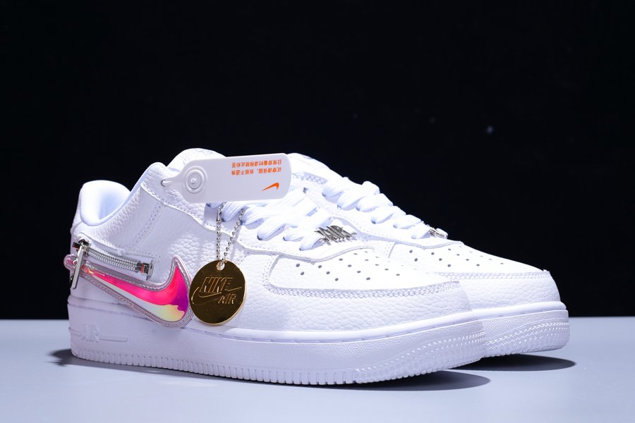 Coming in the low top variety, this Air Force 1 is highlighted by zippers on the lateral side panels that are attached to iridescent Swooshes that run down to the midsole. Silver Nike branding on the tongue and heels, black Swooshes on the medial side panels, and silver “AIR” lace dubraes round out the look on this Air Force 1 that will be releasing soon.