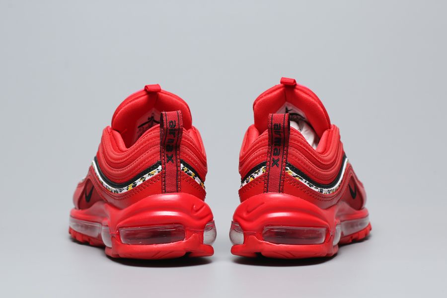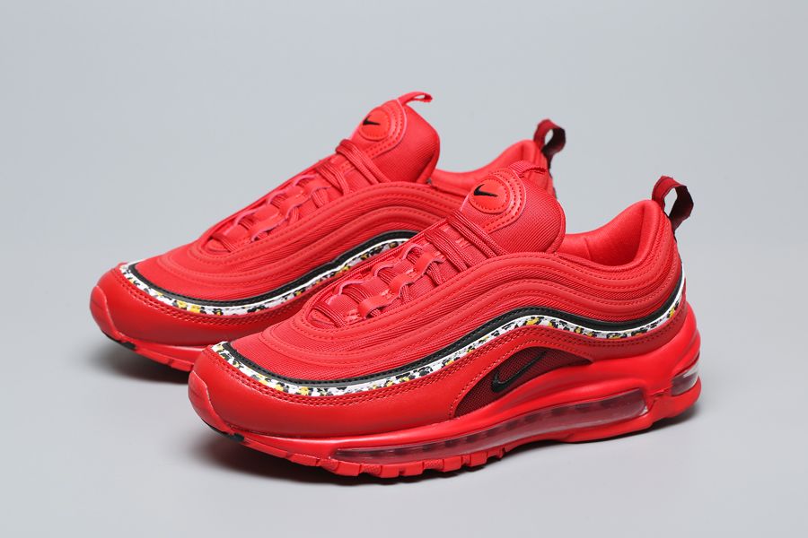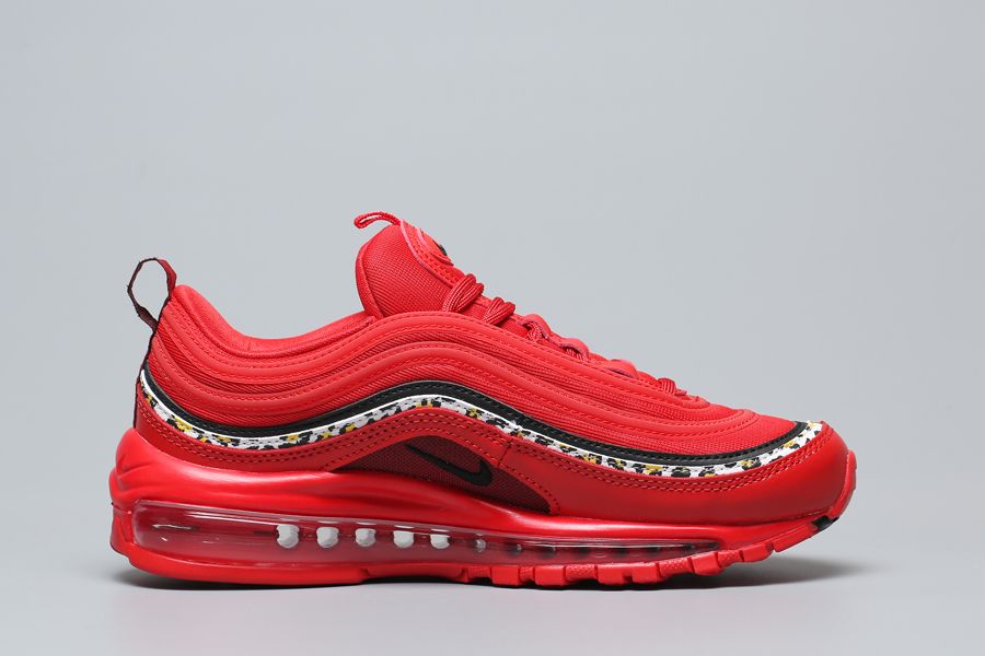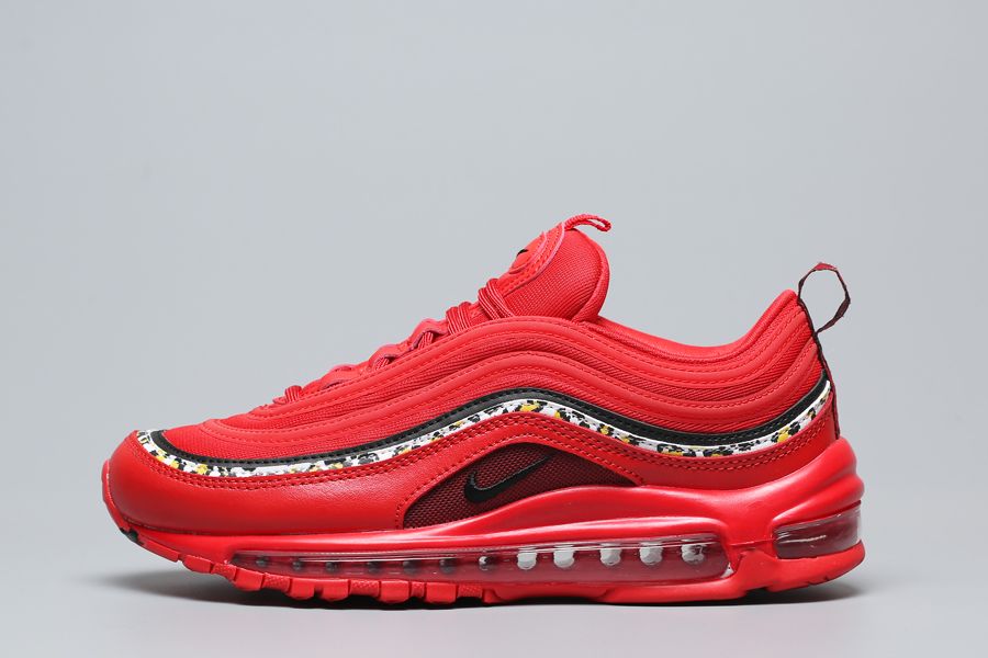A red mesh upper features tonal overlays, a red leather mud guard, and sits atop a matching midsole. A singular black stripe and black branding hits act as subtle hits of contrast. This colorway’s most notable feature is the leopard print stripe wrapping the upper. The wild pattern is also displayed on each insole.