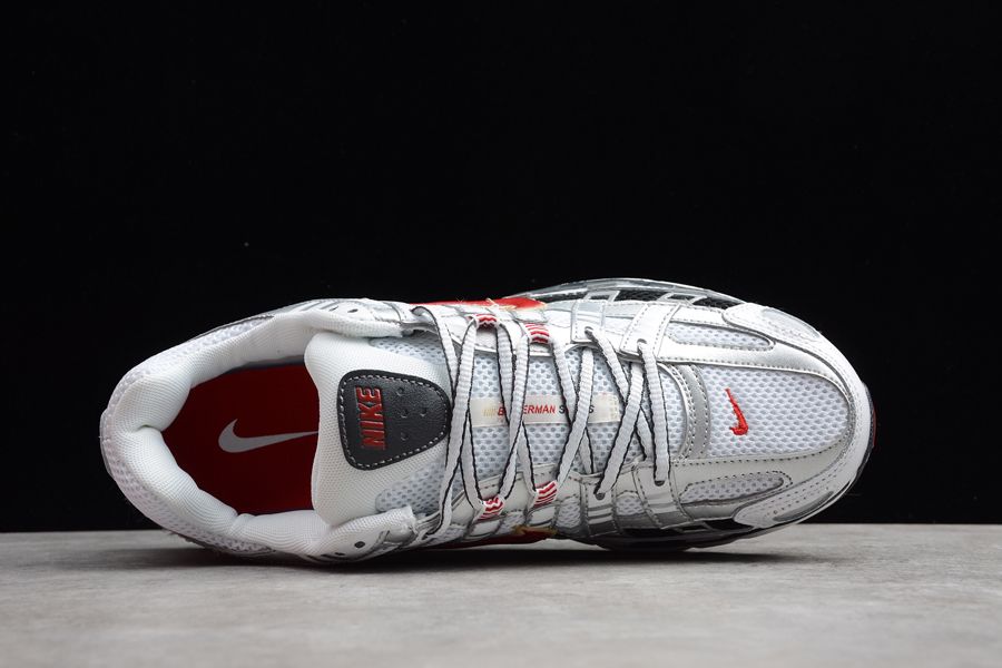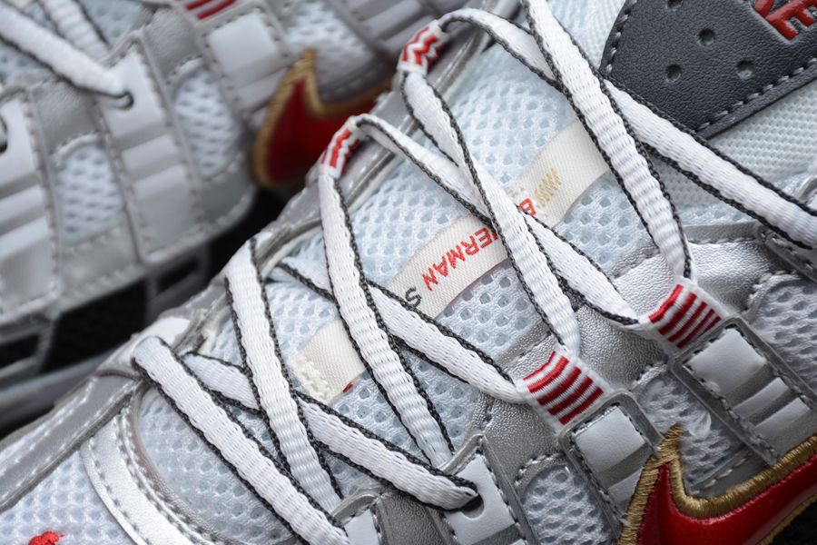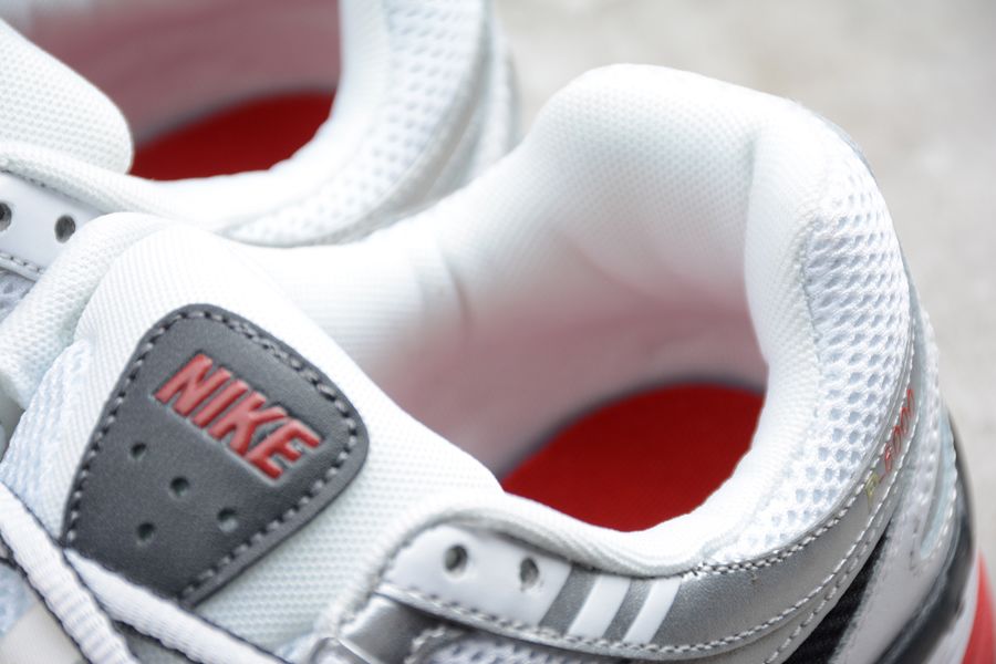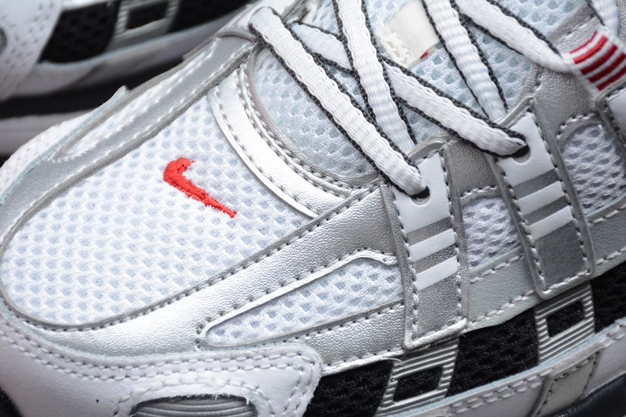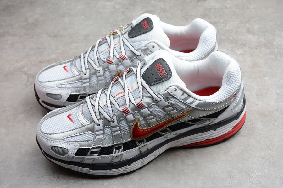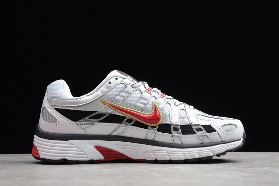 The Nike P-6000 “Varsity Red” is a modern design with heavy inspiration from the 2000s era of running shoes. This P-6000 features a mesh upper in white and dark grey with synthetic silver overlays for a technical design. The colorway features Varsity Red accents, as well as metallic gold thread around each side Swoosh.
