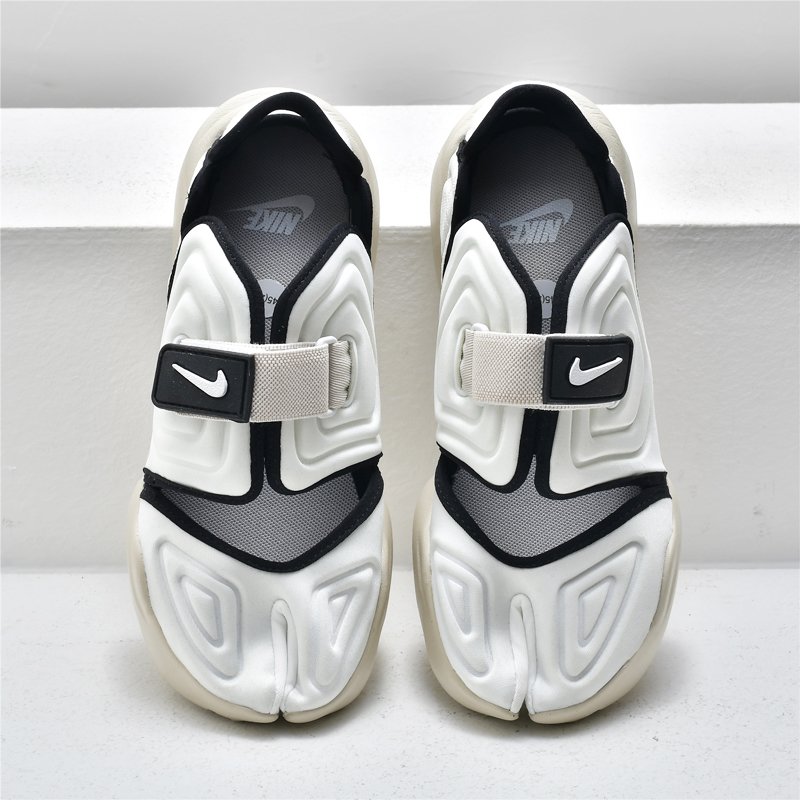 A white neoprene upper is outlined with black piping and embossed with geometric detailing. A velcro Nike logo buckle secures the sneaker-sandal hybrid, while mesh paneling at the heel offers additional texture. Of course, the Rift’s signature split-toe design remains intact.