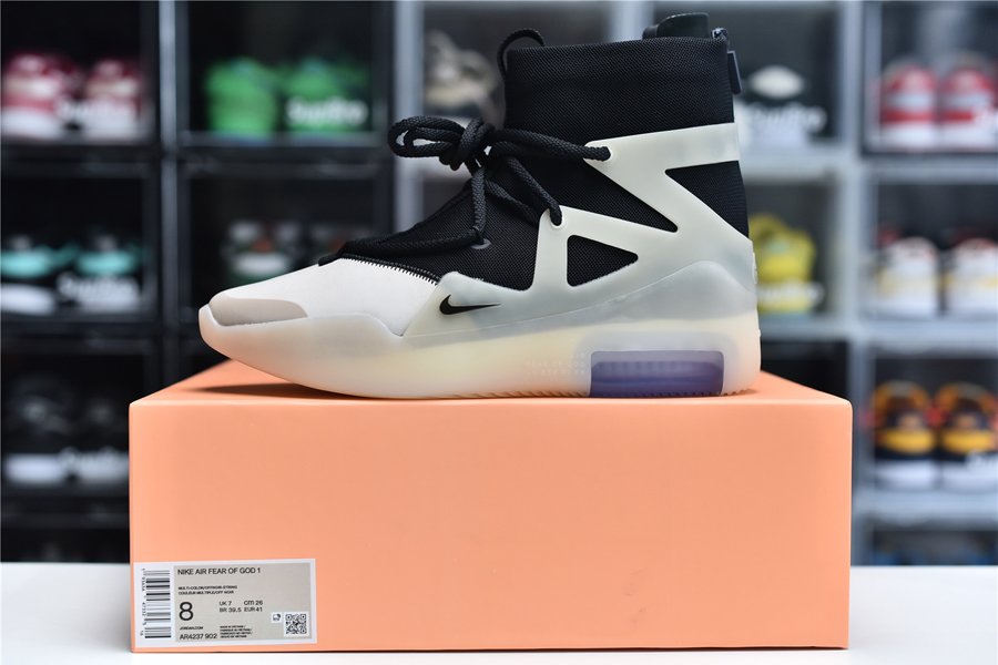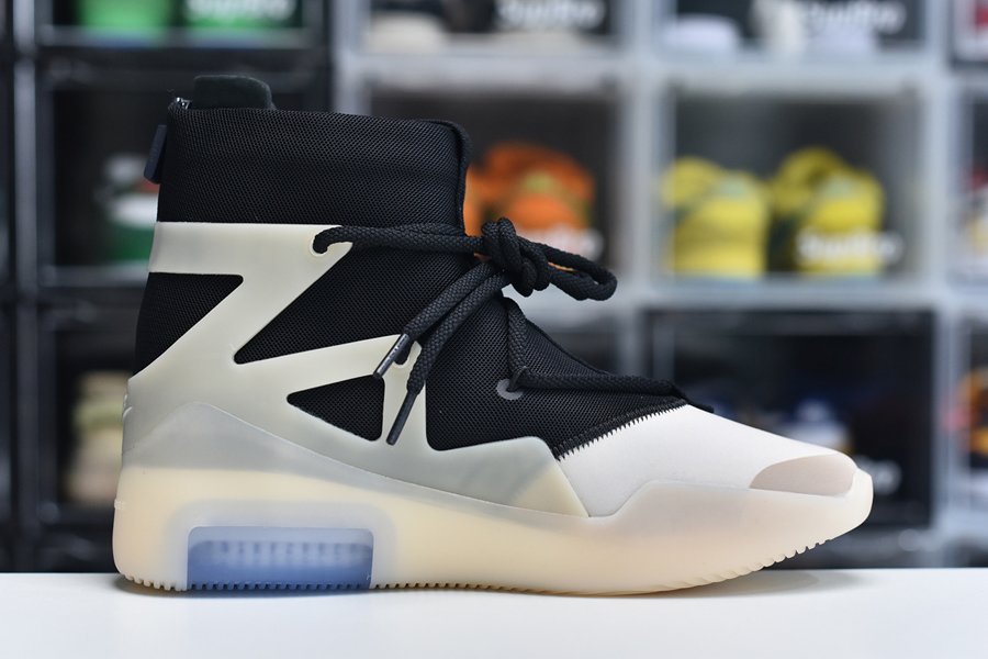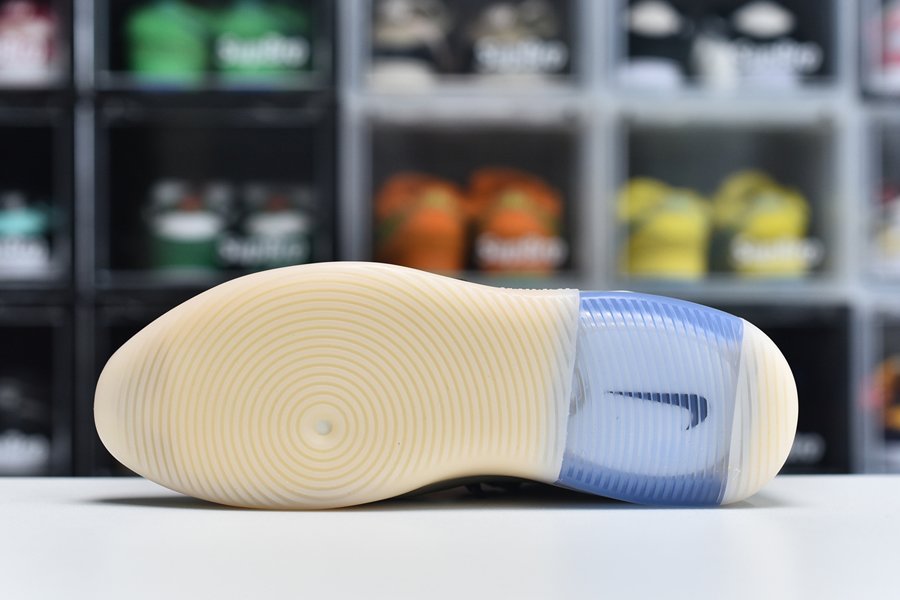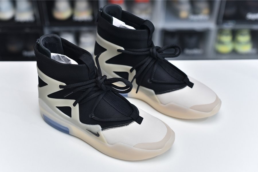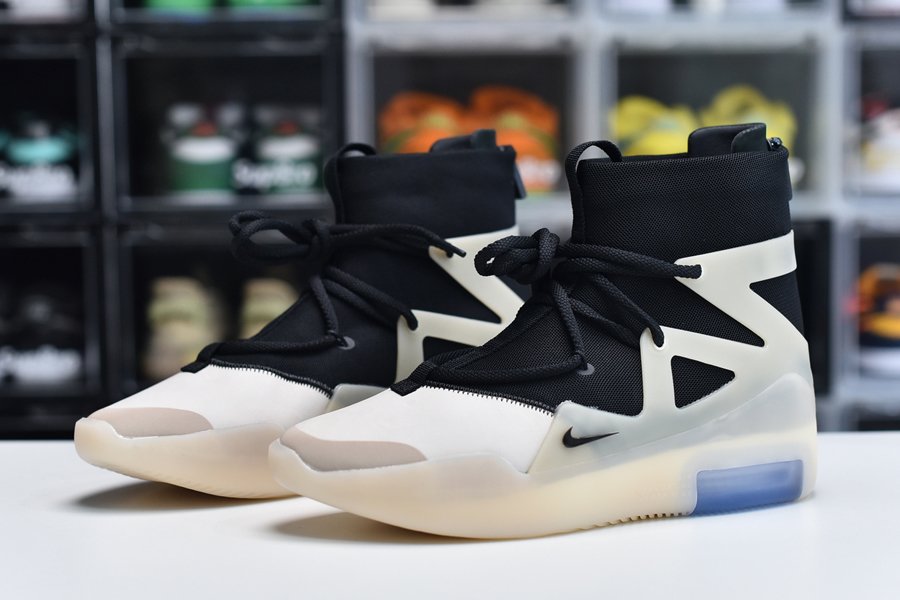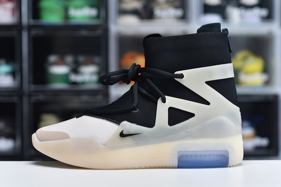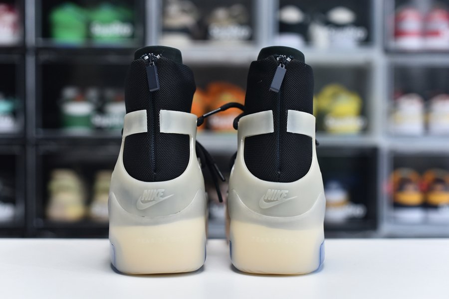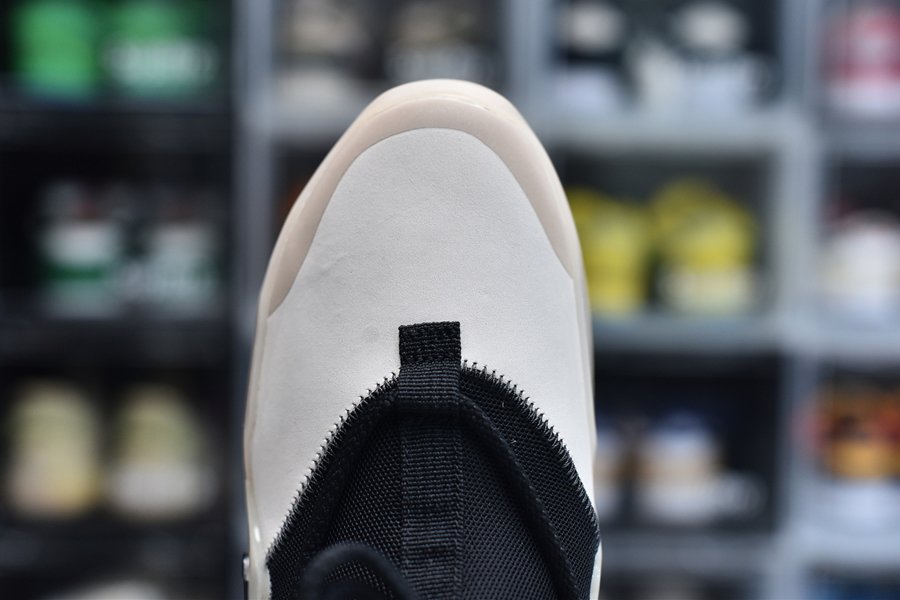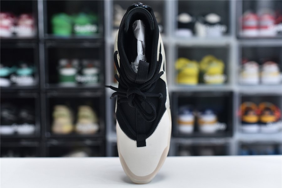 The upper features a black nylon collar and a contrasting cream suede forefoot. The color repeats on the synthetic cages around the collar that assist in housing the staggered lacing system. A zip closure in the heel allows for easy on-off access. Mini Swoosh detailing appears on the forefoot while Nike Air and Fear of God branding covers the heel. The two-tone color block with a contrasting toe is an homage to Allen Iverson’s fourth signature basketball shoe, the Reebok.