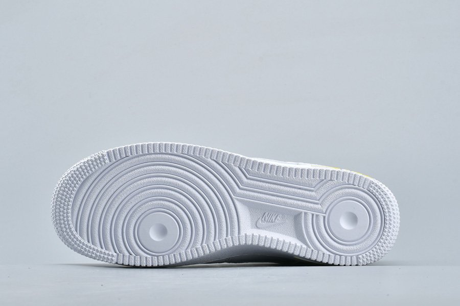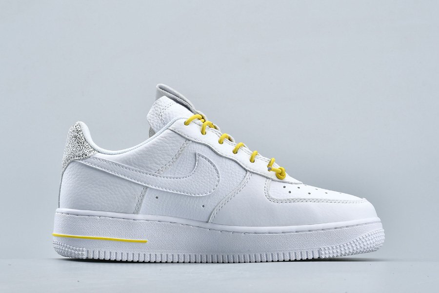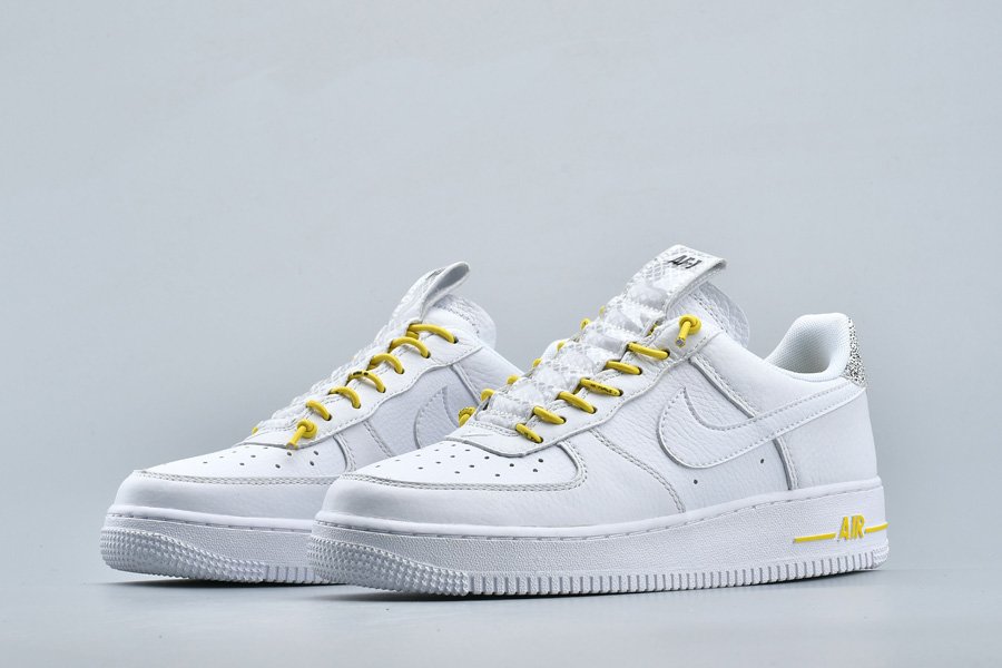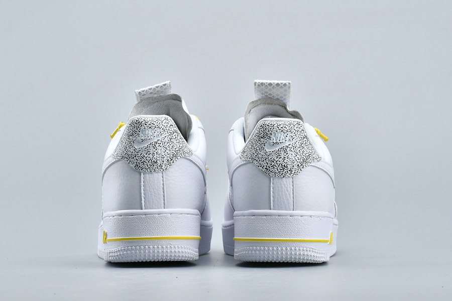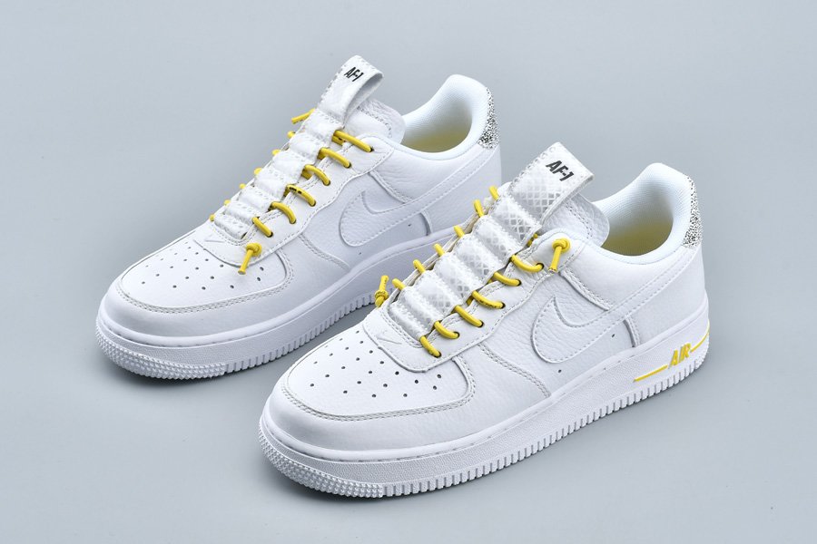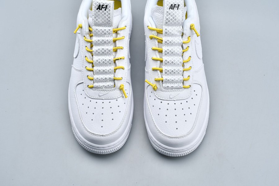 Mix up your rotation with this utility-inspired white and yellow Air Force 1 07, featuring a reworked lace unit and simple touches of colour. Nike takes the typical AF1 silhouette and modernises it with pops of yellow across the midsole and rope style laces. The laces are locked in place with a 3M tab that lights up in the dark, keeping you visible both day and night for wear in Winter and Summer. ‘AF-1’ branding appears overlayed in black across the reflective tongue tab whilst the classic Nike Air logo can faintly be seen on the grainy effect heel panels.