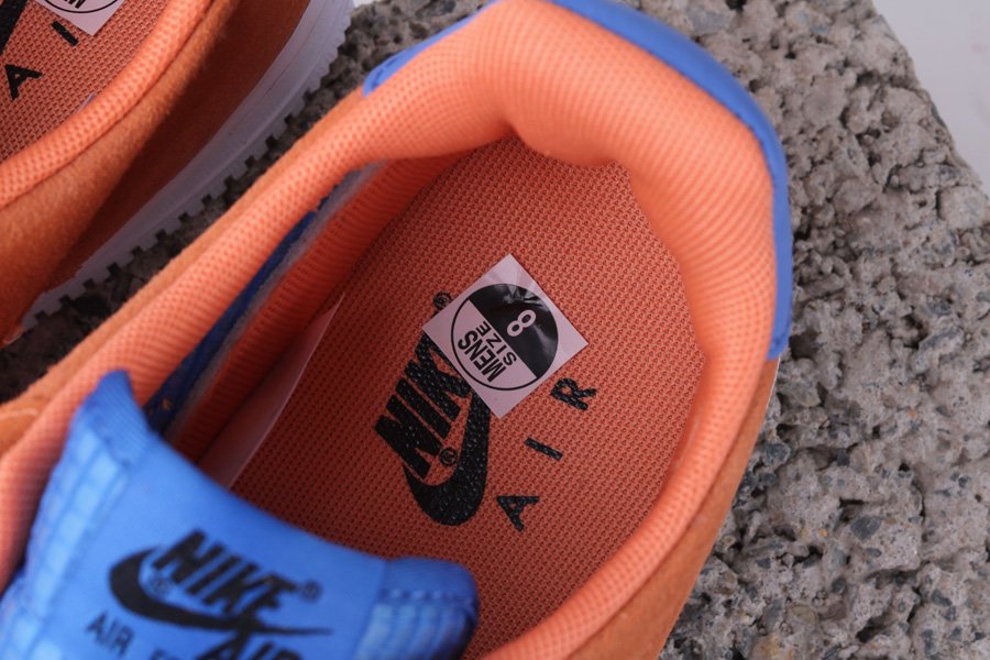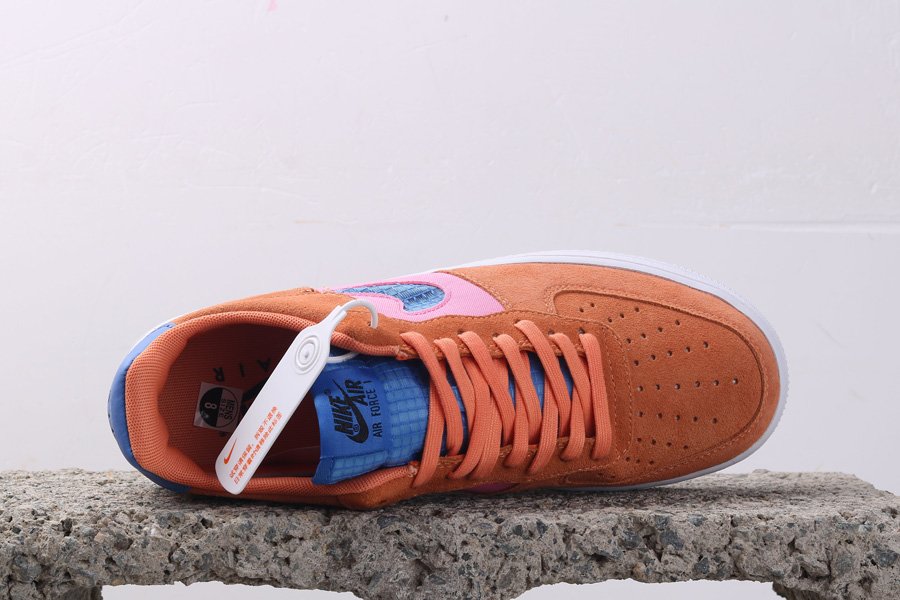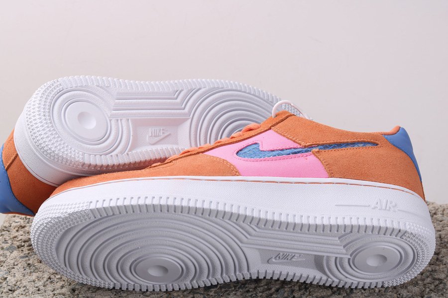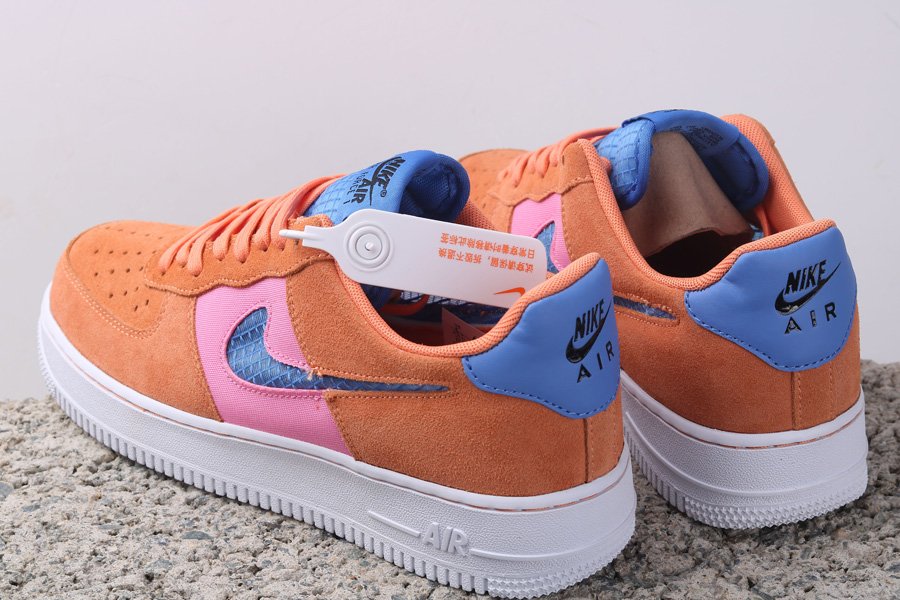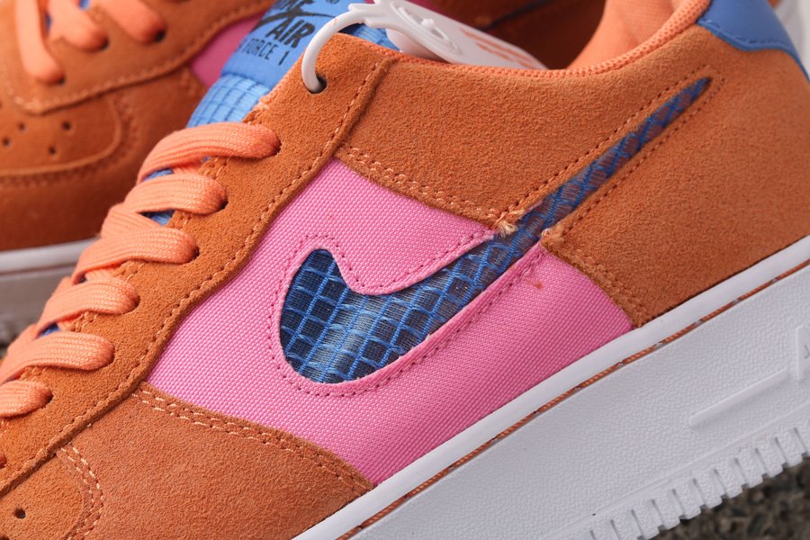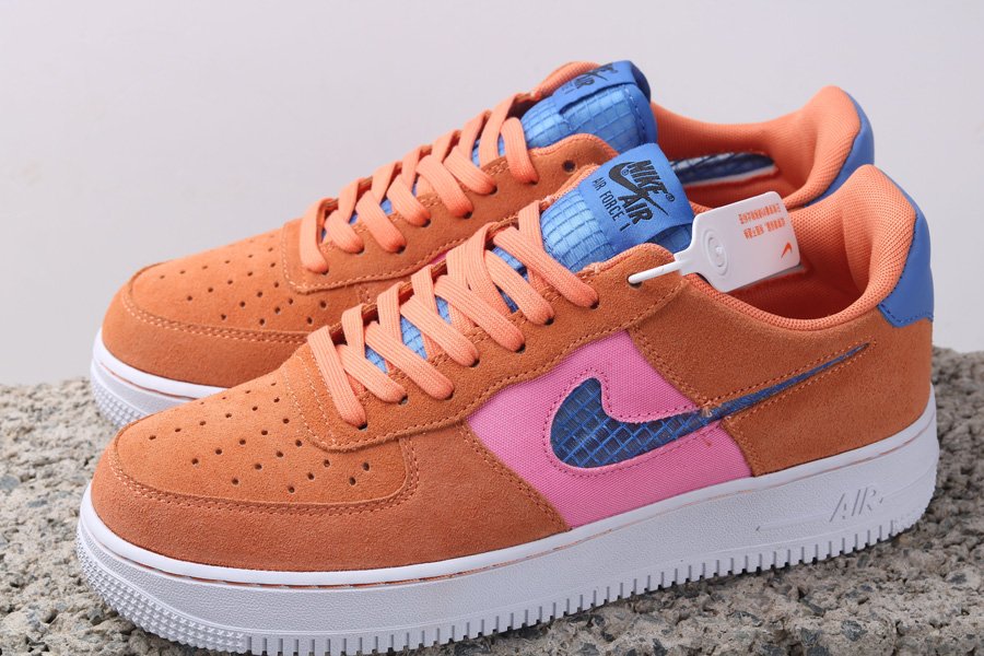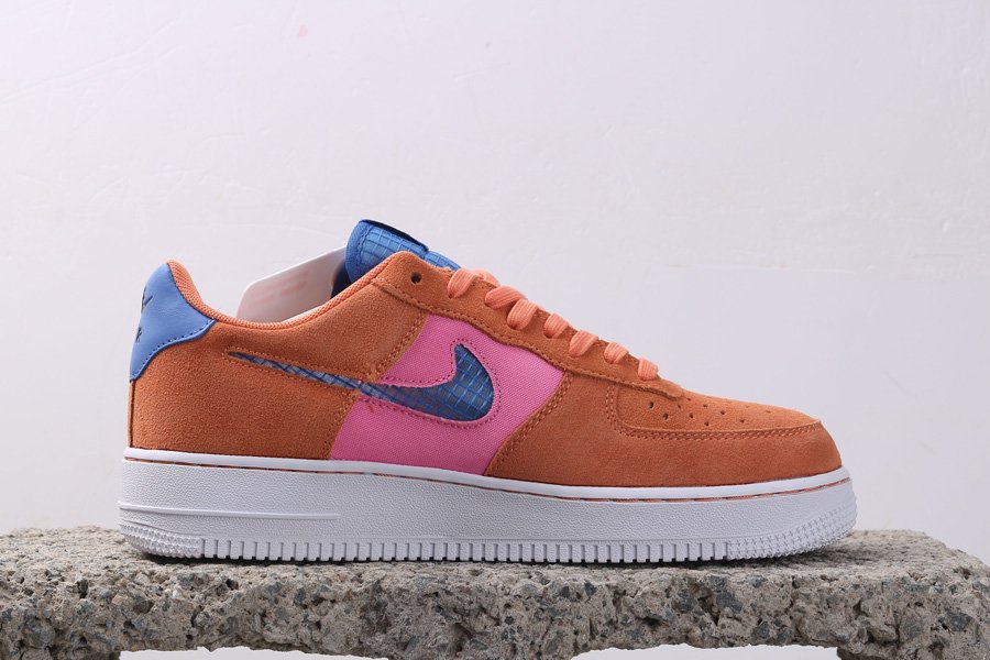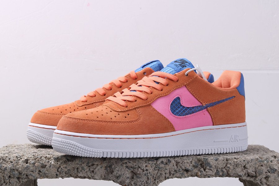 The classic silhouette from the Swoosh starts off with a bold Orange Trance nubuck construction on the upper with an eye-catching royal blue snakeskin-like netting material hitting the Swooshes and tongue. Pink mesh on the side panels, a blue leather heel tab, and a white rubber sole unit round out the look on this Air Force 1 Low.