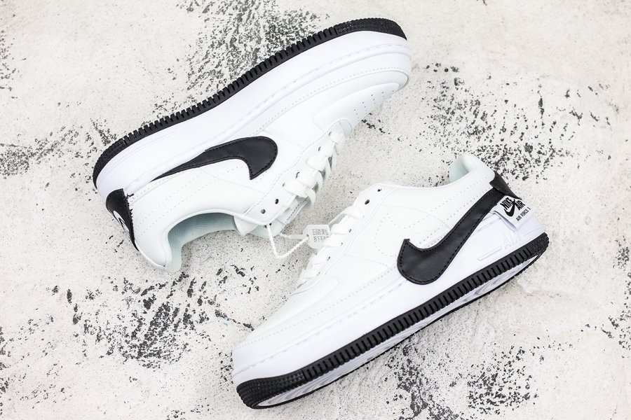 This sleek monochromatic rendition of the Air Force 1 features abstract branding with a bold black Swoosh which crosses from the upper towards the midsole, and a lopsided black and white Nike Air patch at the heel.