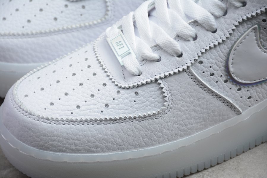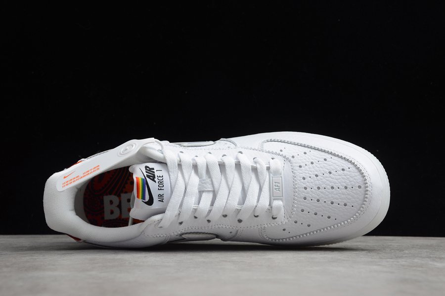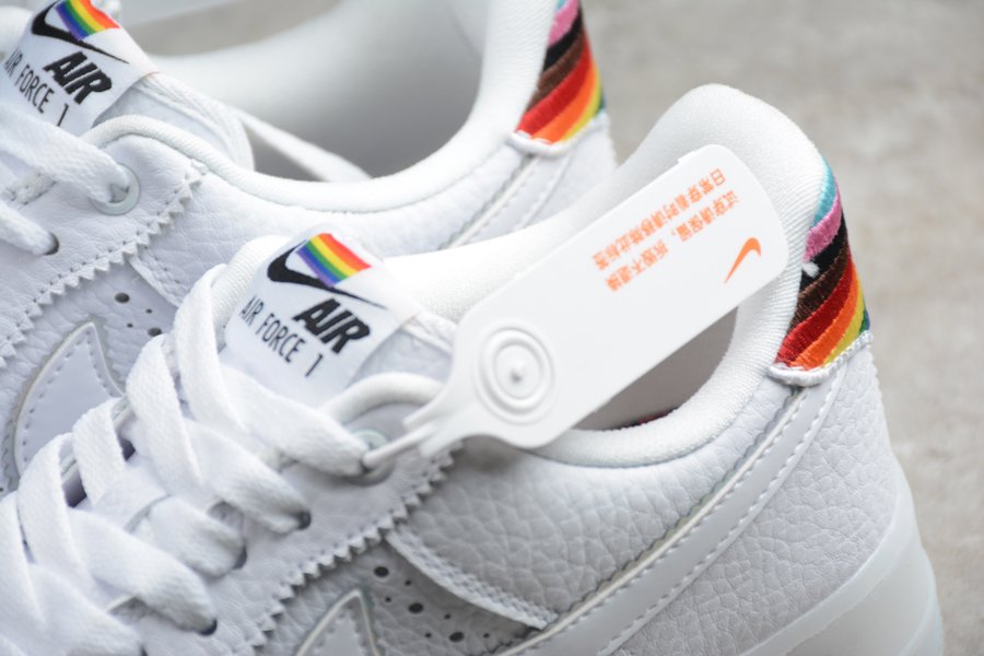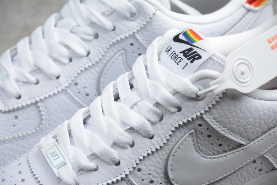 Flaunting a white pebbled leather construction with added perforations on the toe and side panels, unique features include iridescent Swoosh underlays with white leather overlays, a ten-color heel mark inclusive of a spectrum of voices on the heel, the LGBTQ rainbow flag/Nike branding on the tongues and midsole, and BeTrue branding on the insoles. Finally, icy translucent outsoles round out the style.